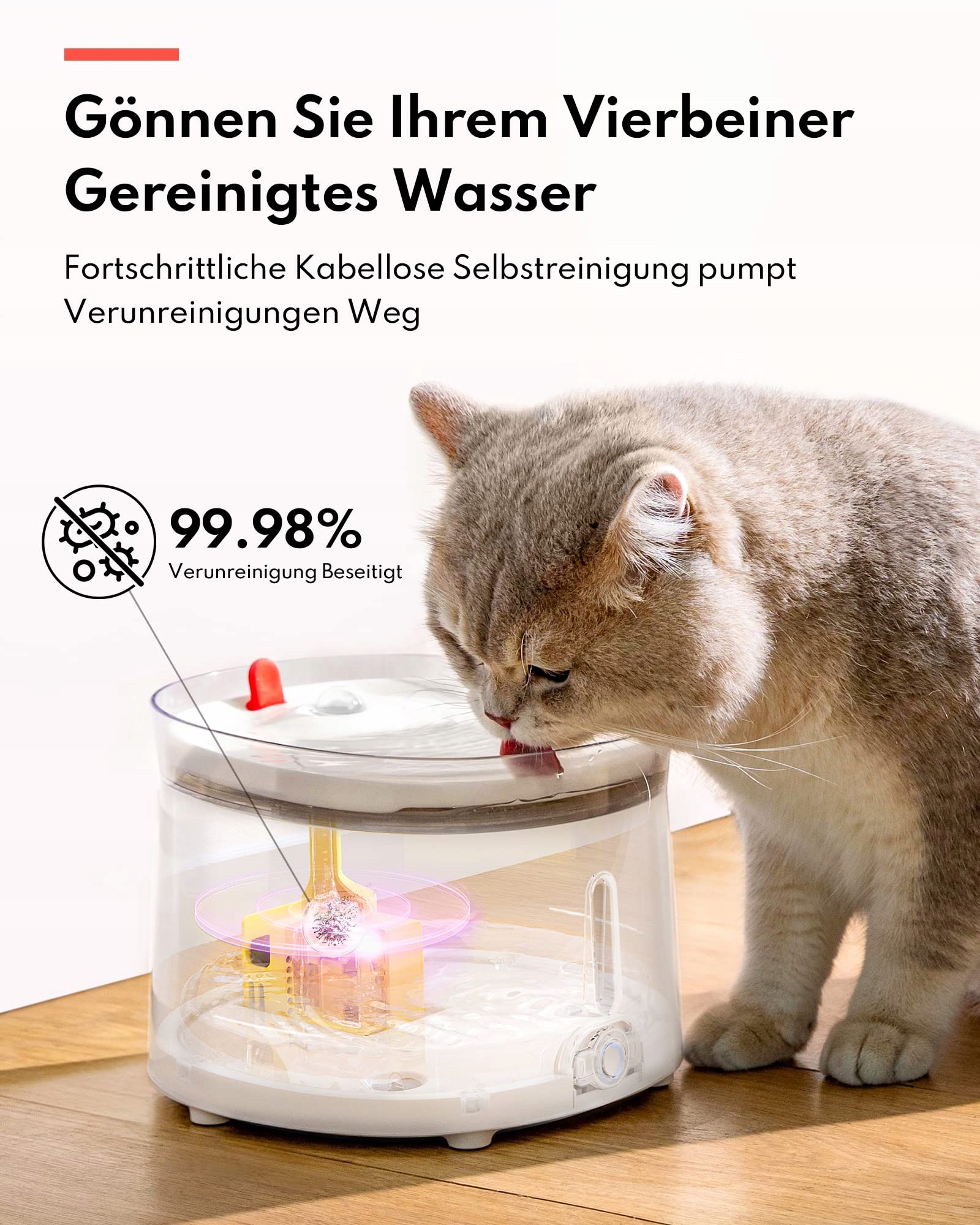 [Lepsze samopoczucie dzięki czystej wodzie]Ta ulepszona bezprzewodowa pompa wodna posiada system samoczyszczenia, który oczyszcza wodę co 2 minuty, aby zapewnić ciągłą czystość wody z wskaźnikiem sterylizacji do 99,98%. Czterostopniowy system oczyszczania skutecznie eliminuje zapachy i poprawia smak. Woda bogata w tlen z długotrwałą higieną przynosi korzyści zdrowotne dla dobrego samopoczucia Twoich czworonożnych przyjaciół. Uwaga: Chociaż nasza pompa jest bezprzewodowa, cały fontanna do picia jest zasilana z sieci elektrycznej.