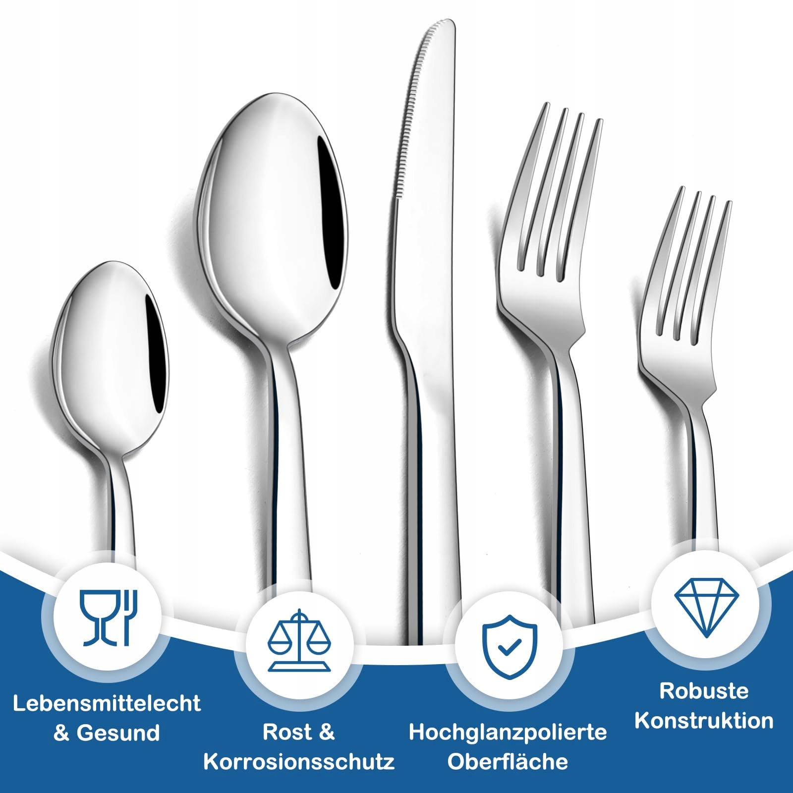 Zdrowe i trwałe - ten zestaw sztućców wykonany jest ze stali nierdzewnej 18/0, bez niebezpiecznych substancji przenikających do jedzenia, odporny na rdzę i nikiel, solidna konstrukcja, niełatwo się wygina ani łamie, zdrowy i trwały do długotrwałego użytkowania