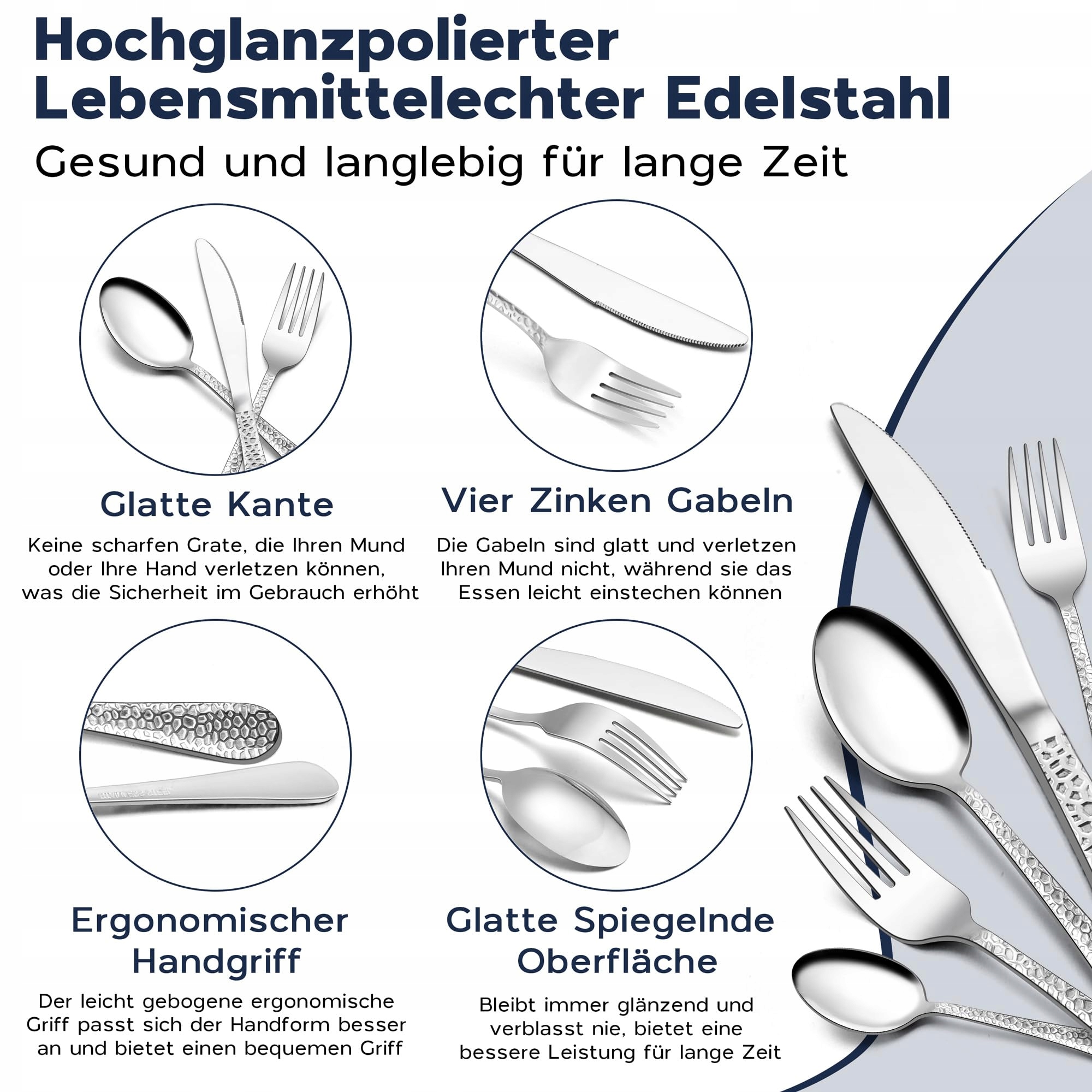 Zdrowe i stabilne: Zestaw sztućców wykonany jest z bezpiecznej dla żywności stali nierdzewnej, bez niebezpiecznych substancji przenikających do jedzenia. Solidna konstrukcja zapobiega rdzewieniu sztućców i nie pozwala na łatwe ich wyginanie, dzięki czemu pozostają stabilne i zdrowe przez długi czas