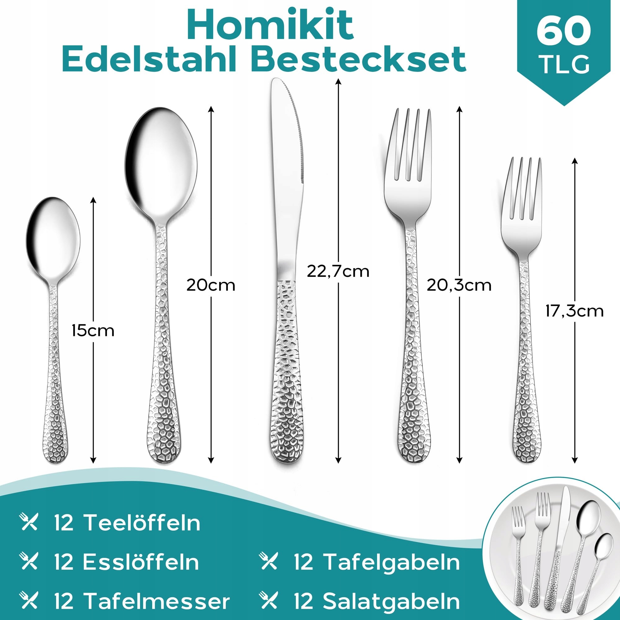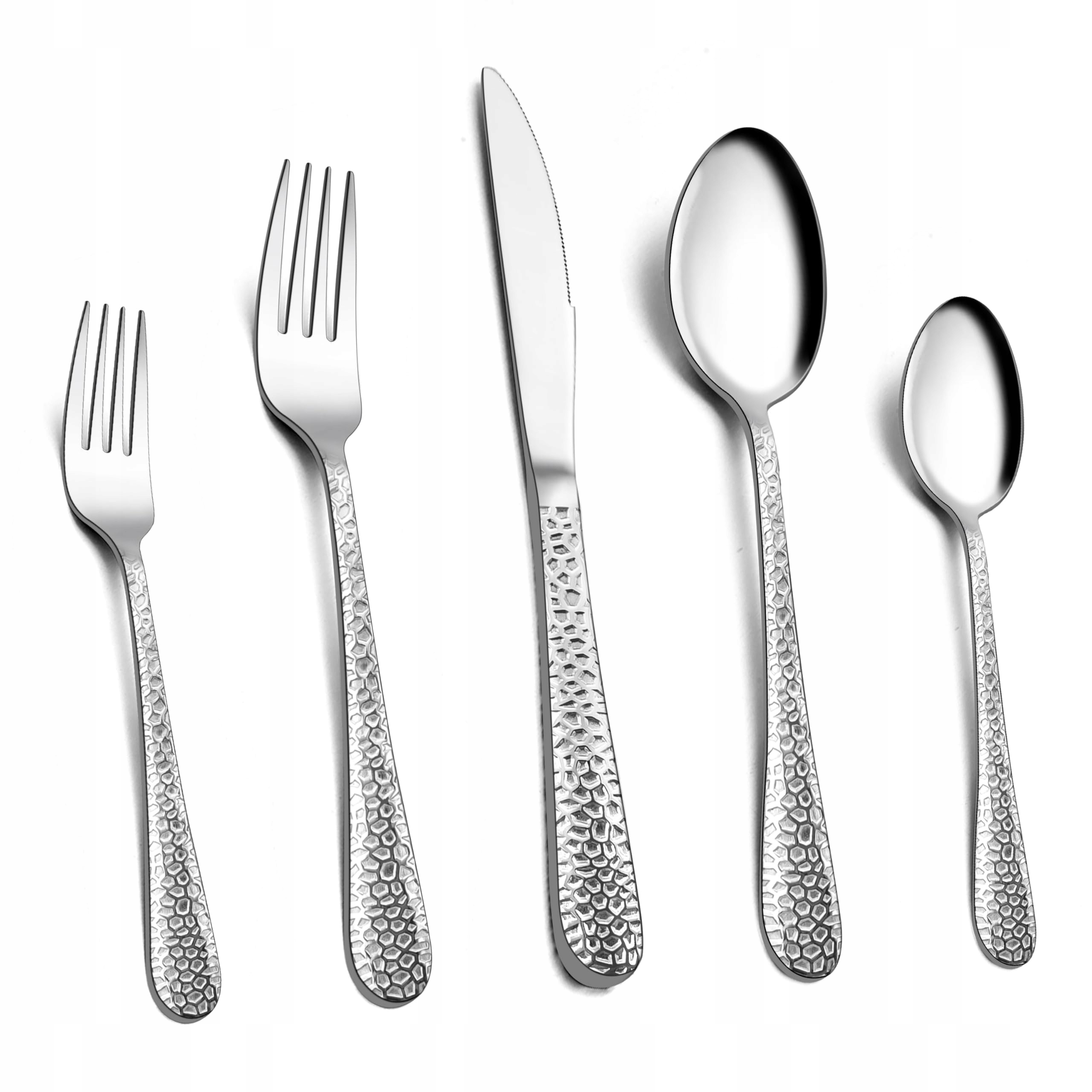 Zestaw sztućców Homikit, 60-częściowy zestaw sztućców dla 12 osób, stal nierdzewna młotkowana, sztućce z nożem, widelcem i łyżką dla rodziny, imprezy, restauracji, zaokrąglone uchwyty & nadaje się do zmywarki