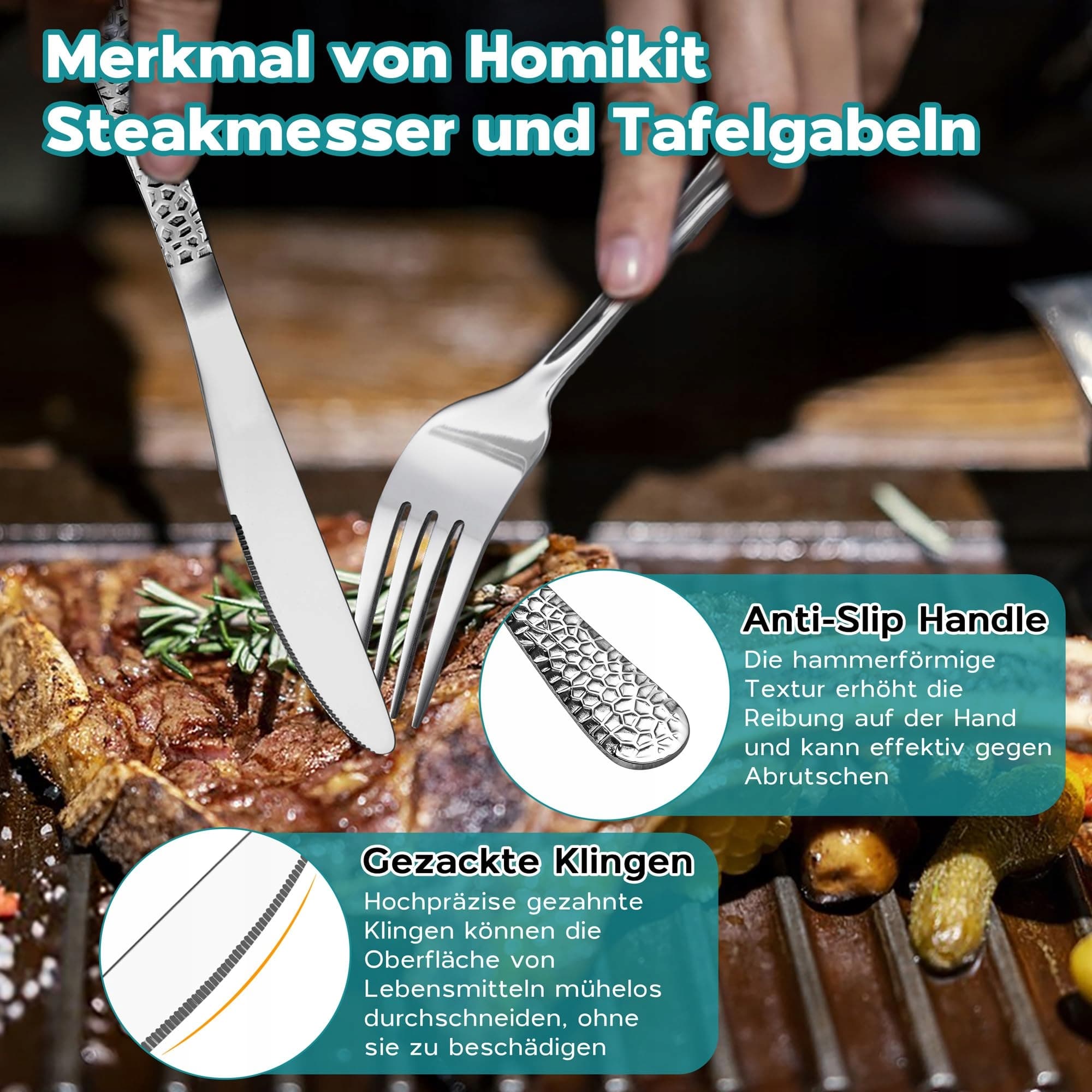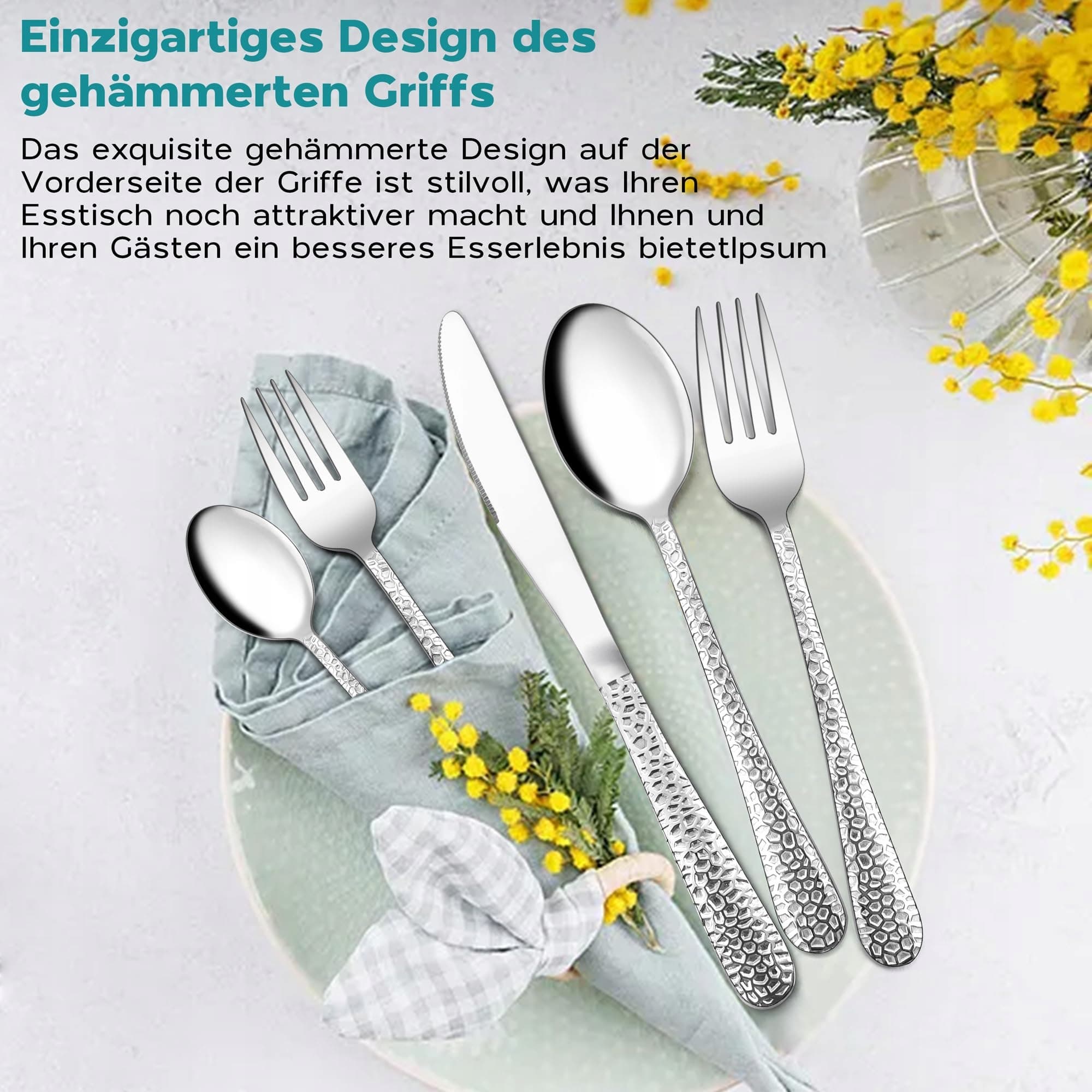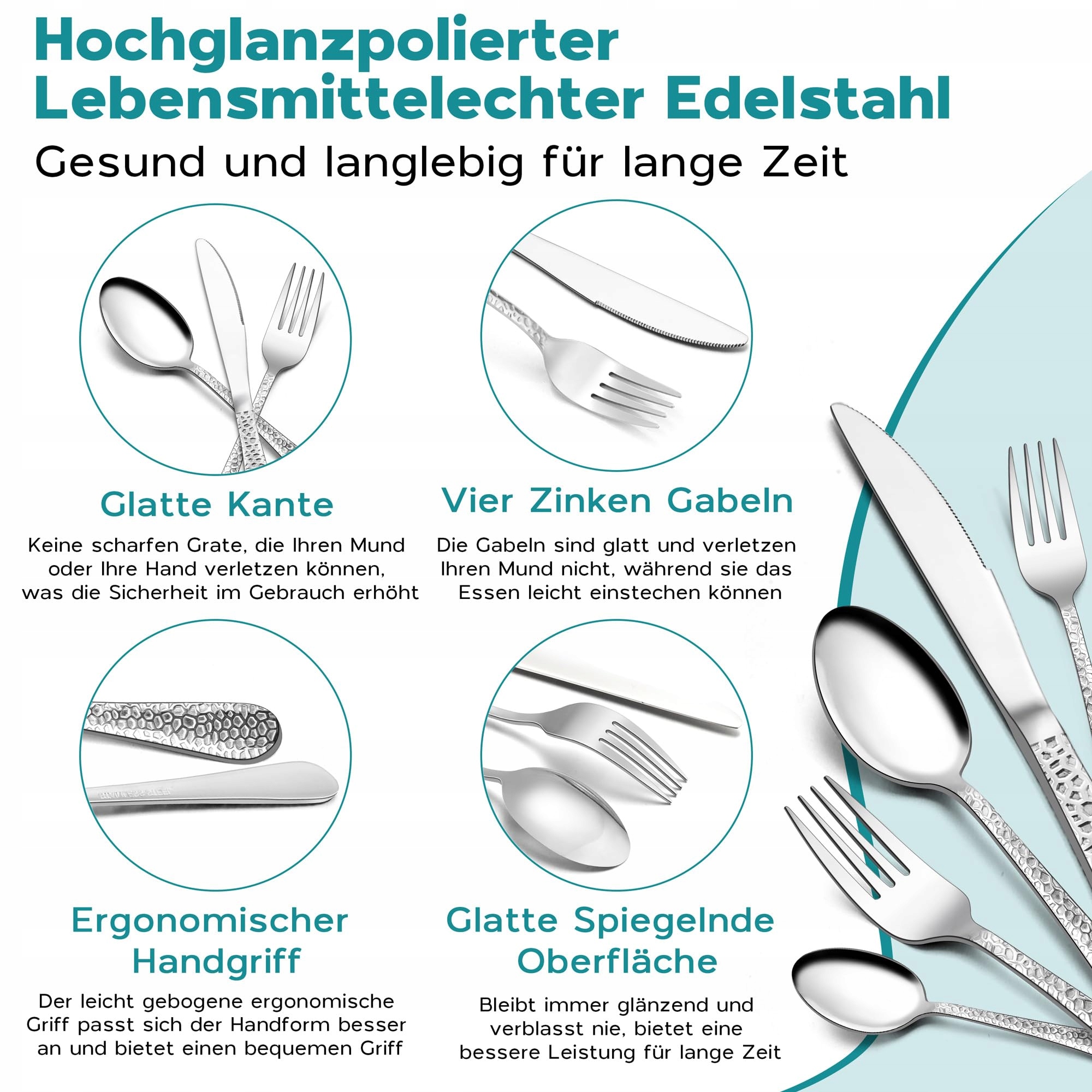 Wszechstronny: praktyczny zestaw sztućców do codziennego użytku w domu, restauracjach lub hotelach, odpowiedni na imprezy, kempingi, wesela, bufety lub inne wydarzenia, także eleganckie i dyskretne sztućce pasujące do zastawy stołowej w różnych stylach