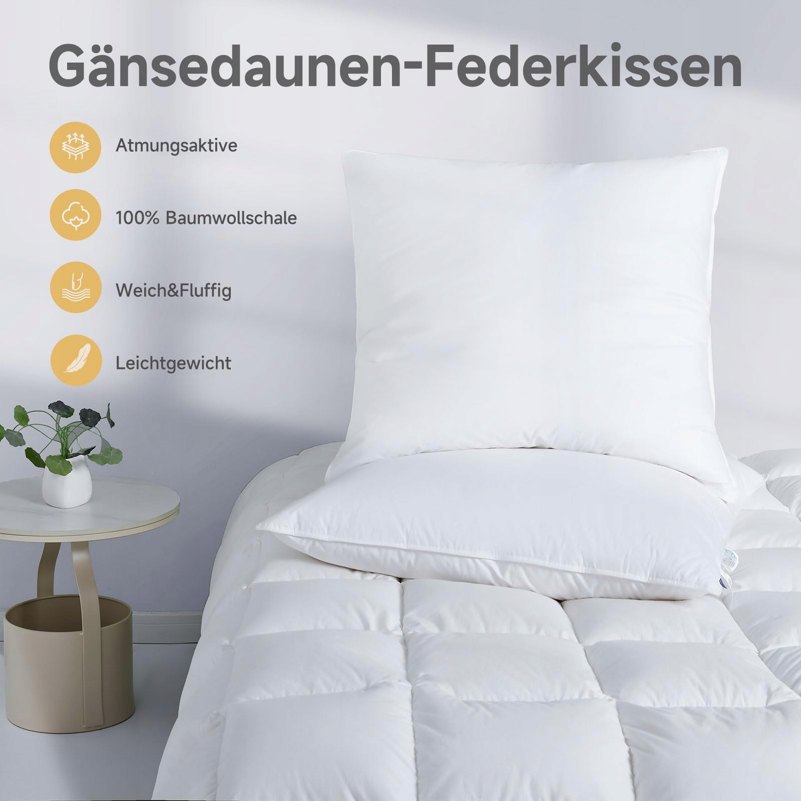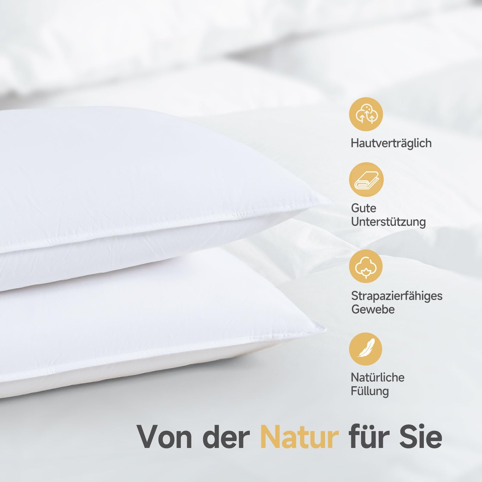 100 % naturalny komfort: Materiał naszych poduszek wykonany jest w 100 % z czystej bawełny, a wypełnienie z naturalnych puchowych piór, które są miękkie i oddychające, dzięki czemu utrzymują suchość i chłód przez całą noc. Ponadto te wypełnienia z puchu mają wysoką sprężystość i elastyczność, aby dopasować się do krzywizny Twojej głowy i szyi oraz zapewnić najlepsze doświadczenie snu.