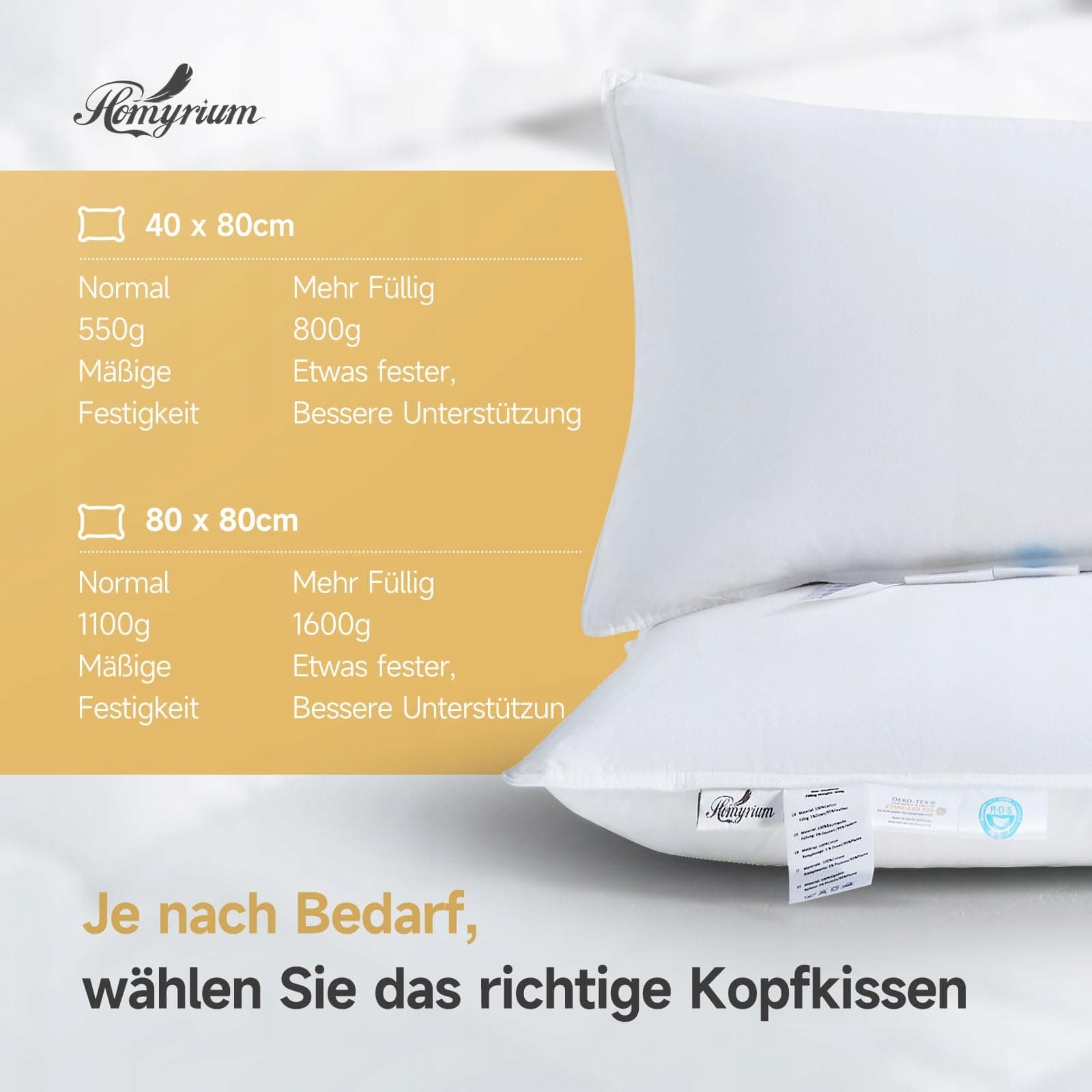Dwie opcje: Możesz wybrać rozmiar i wagę wypełnienia według swoich potrzeb. Poduszki w rozmiarze 40*80 cm z wypełnieniem 550 g są stosunkowo miększe i nieco mniej wspierające niż poduszki z wypełnieniem 800 g. Jeśli wolisz miększą i niższą poduszkę, polecam poduszkę 550 g, jeśli wolisz wyższą i bardziej wspierającą poduszkę, lepsza będzie poduszka 800 g.