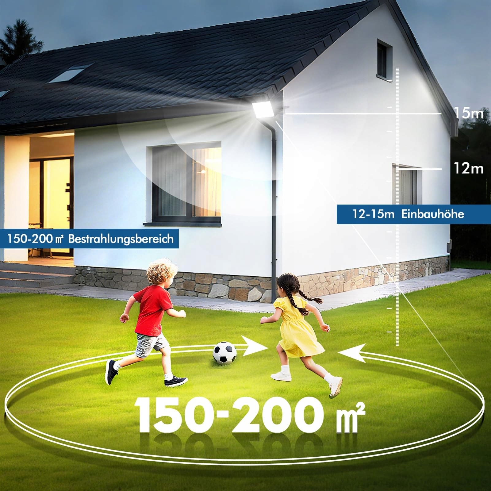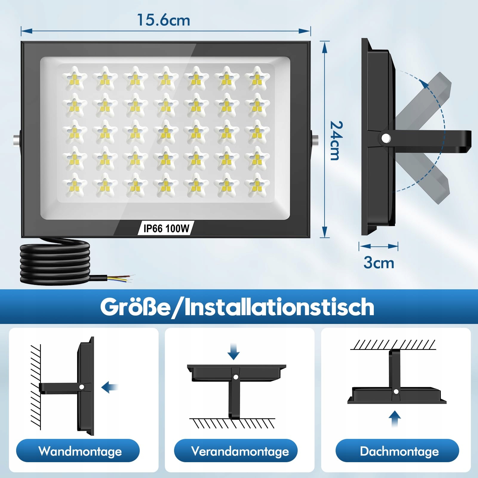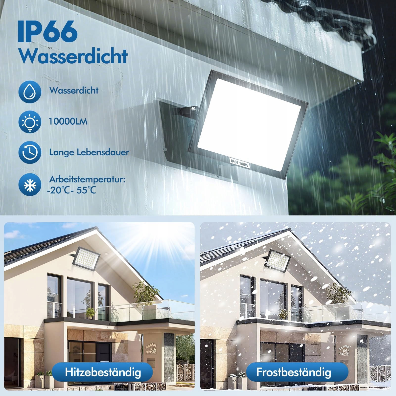 [OCHRONĄ IP66: UNIWERSALNE ZASTOSOWANIE] Reflektor LED na zewnątrz w świetle dziennym z certyfikatem IP66 jest idealny do użytku wewnętrznego i zewnętrznego – jako oświetlenie stadionów, ogrodów, placów, parków, dachów lub ulic. Jego wodoodporna i pyłoszczelna konstrukcja gwarantuje niezawodną pracę w każdych warunkach.