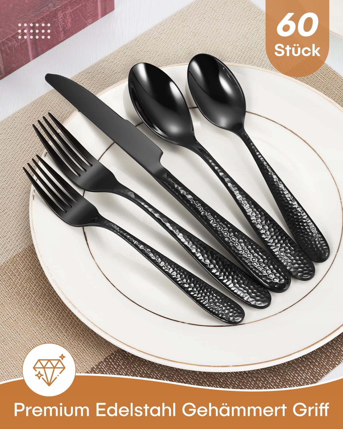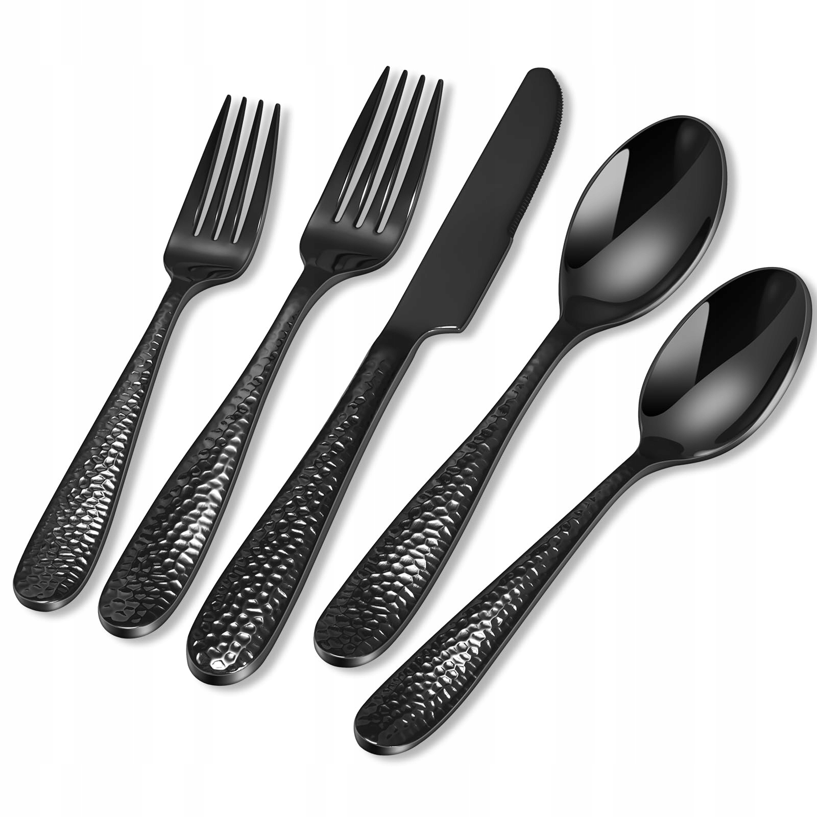 Zestaw sztućców dla 12 osób czarny, HONKKU 60-częściowy młotkowany zestaw sztućców, premium zestaw sztućców ze stali nierdzewnej z nożami, widelcami, łyżkami dla rodzin/imprez/restauracji, polerowany na wysoki połysk, odporny na zmywarkę