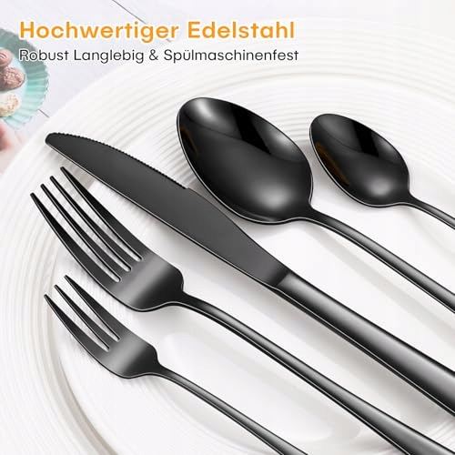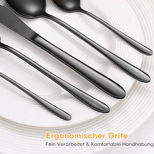 30-częściowy zestaw sztućców dla 6 osób: 30-częściowy czarny zestaw sztućców składający się z 6 noży do obiadu, 6 widelców stołowych, 6 widelców do deserów, 6 łyżek do zupy i 6 łyżeczek do kawy. Każdy element sztućców jest wielokrotnie polerowany na lustro, aby połączyć funkcjonalność z pięknem i uczynić każdy posiłek wyjątkowym.