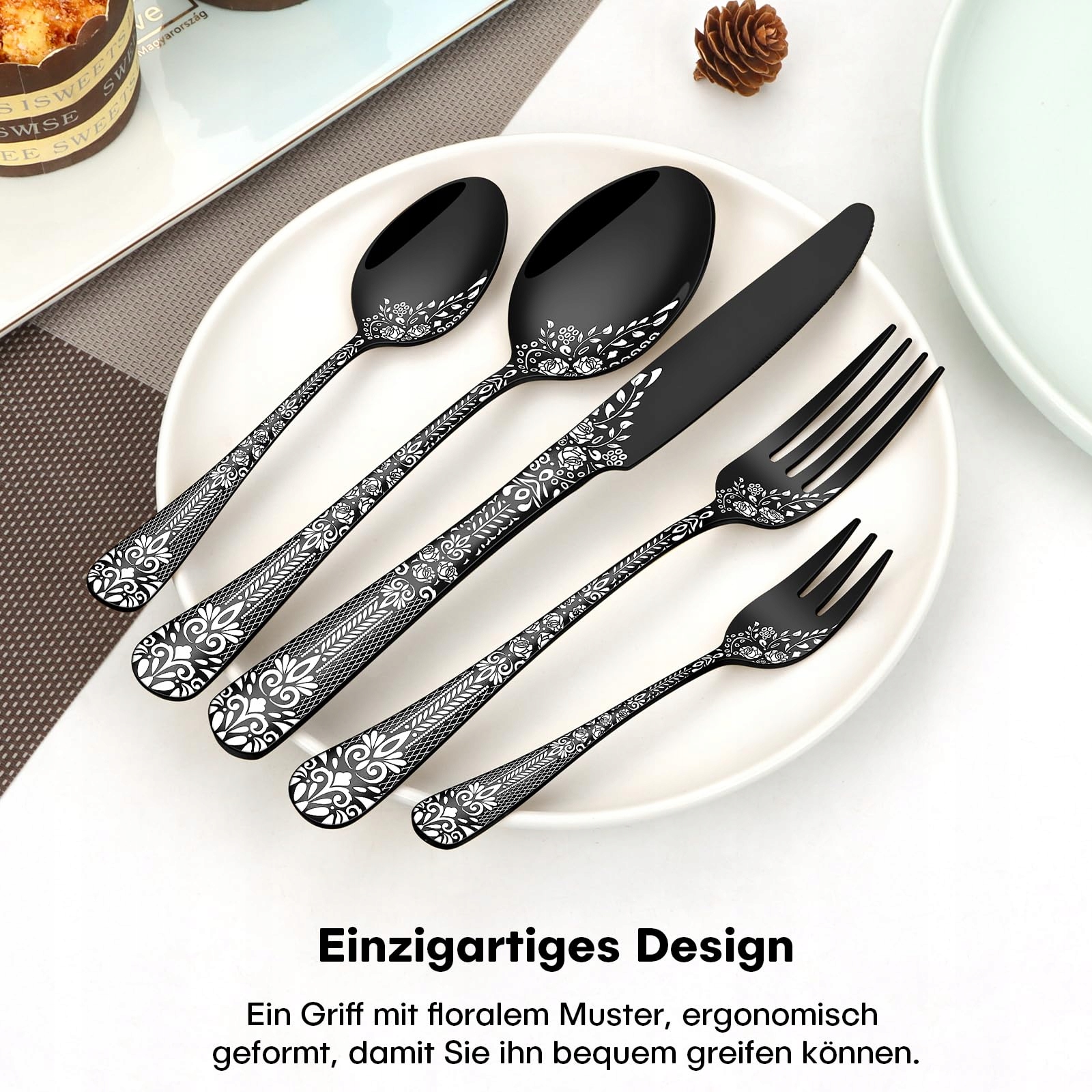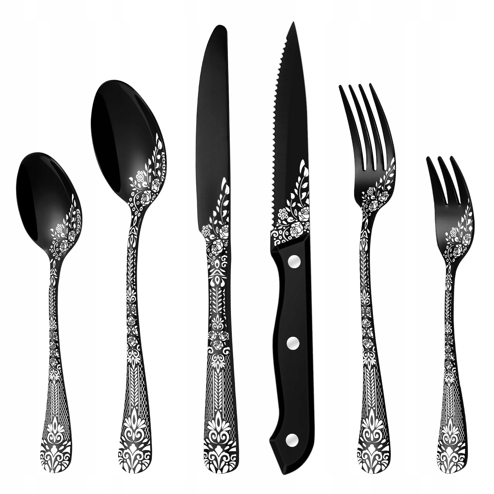 Zestaw sztućców czarnych dla 6 osób, HONKKU 36-częściowy zestaw ze stali nierdzewnej z nożami do steków, zestaw sztućców lustrzanie polerowanych z wzorami kwiatowymi, zestaw widelców, łyżek i noży odporny na zmywarkę