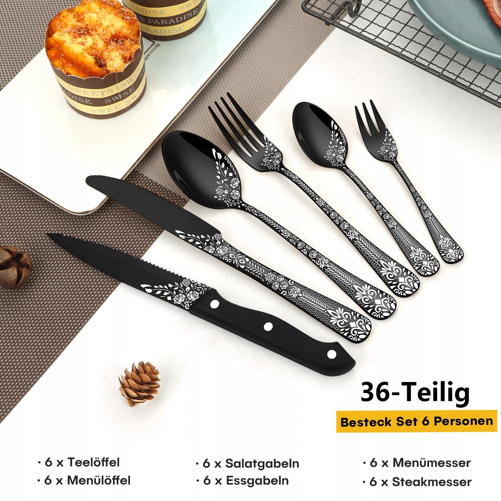 36-częściowy zestaw sztućców dla 6 osób -- HONKKU sztućce czarne składają się z 36 elementów, specjalnie dla 6 osób z 6 nożami do steków, 6 nożami stołowymi, 6 widelcami do jedzenia, 6 widelcami deserowymi, 6 łyżkami do jedzenia i 6 łyżeczkami. Starannie wykute, wysokiej jakości noże do steków z ostrymi, ząbkowanymi ostrzami, które ułatwiają krojenie mięsa, trzykrotnie nitowane uchwyty są ergonomicznie zaprojektowane. Te sztućce spełniają wszystkie Twoje potrzeby podczas jedzenia i są dobrym wyborem dla każdej rodziny.