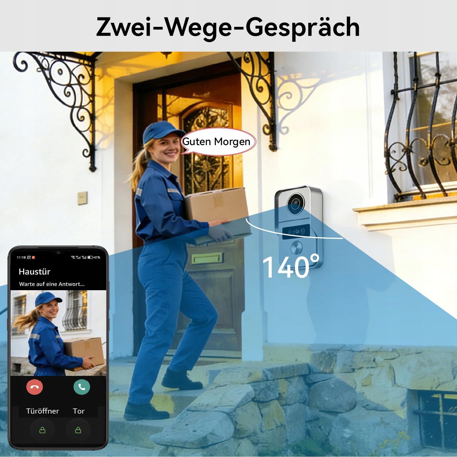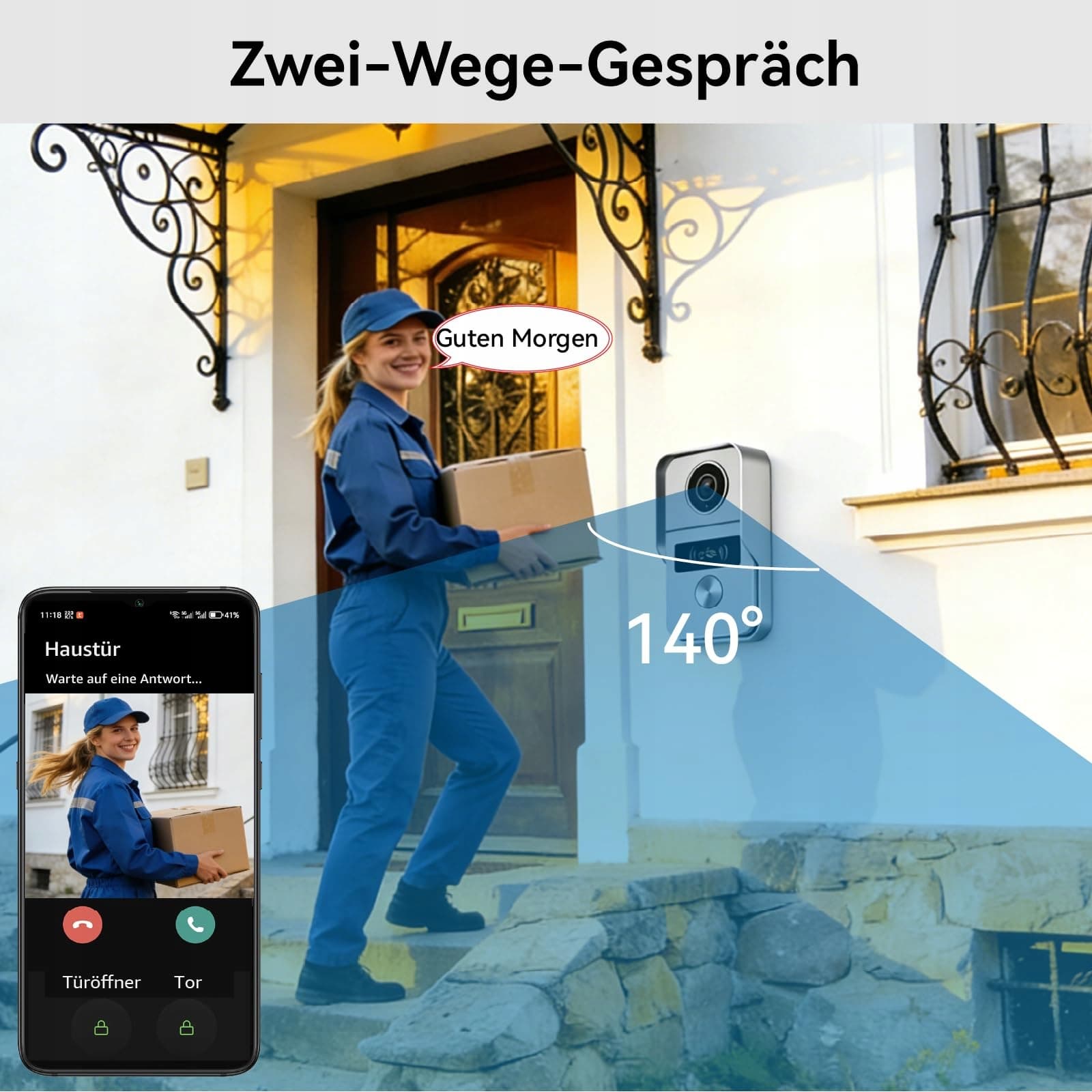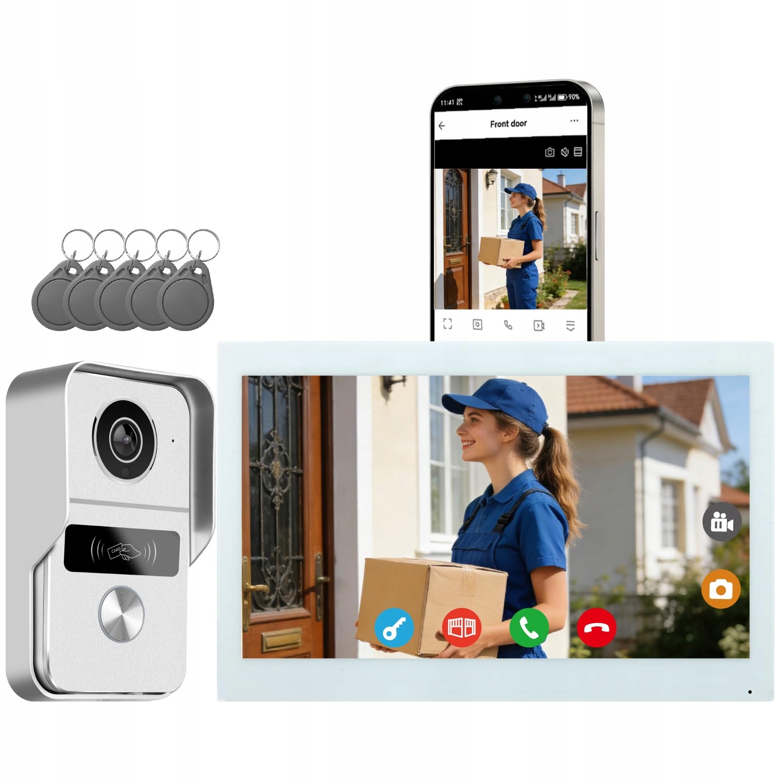 Podwójne sterowanie do odblokowywania zamka i bramy przez aplikację, karty RFID 13,56 MHz, telefon z NFC, monitor wewnętrzny, otwieracz drzwi