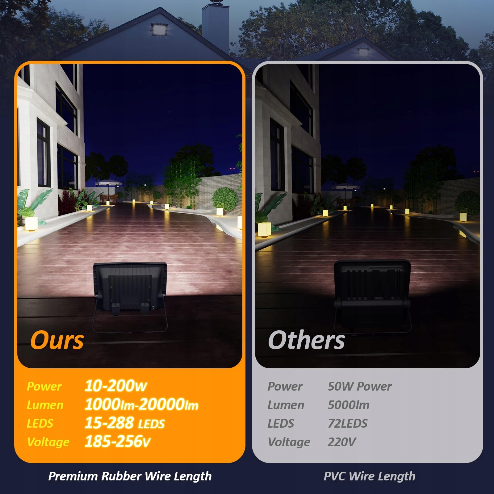 Szerokie zastosowanie: Reflektory LED do użytku wewnętrznego i zewnętrznego, odpowiednie do oświetlenia wewnętrznego i zewnętrznego boisk do koszykówki, stadionów, magazynów, ogrodów, podwórek, garaży, dachów, dziedzińców, parkingów, placów i nabrzeży.