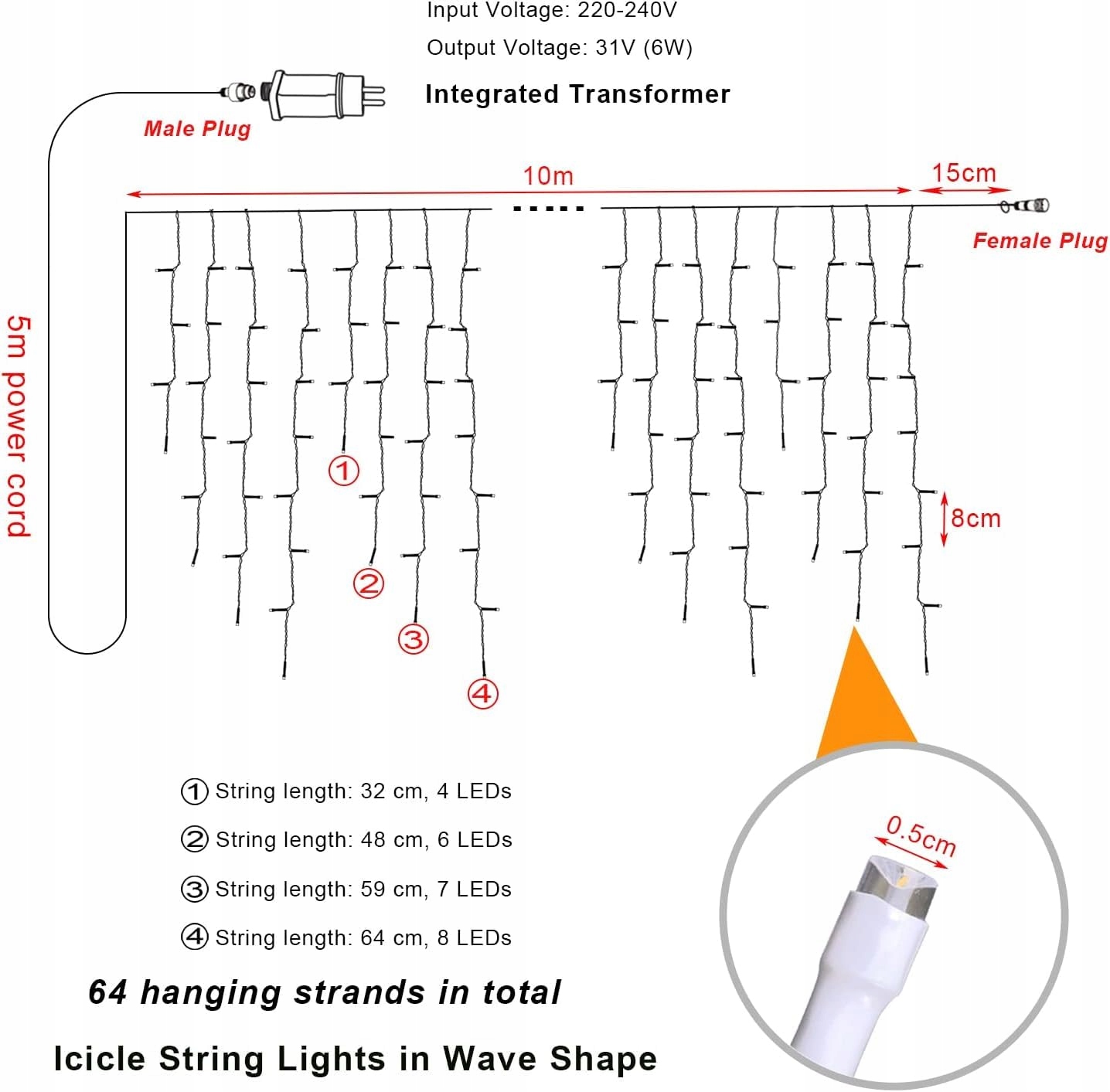 【Wodoodporność IP44 + funkcja timera】Wodoodporny łańcuch świetlny IP44 jest sterowany przez wtyczkę, która jest wyposażona w funkcję timera 6/18 godzin. Naciśnij przycisk na wtyczce i przytrzymaj go przez 3 sekundy. Gdy przycisk zaświeci się na zielono, funkcja timera zostanie aktywowana, dzięki czemu łańcuch świetlny wyłączy się automatycznie po 6 godzinach i ponownie włączy po 18 godzinach.