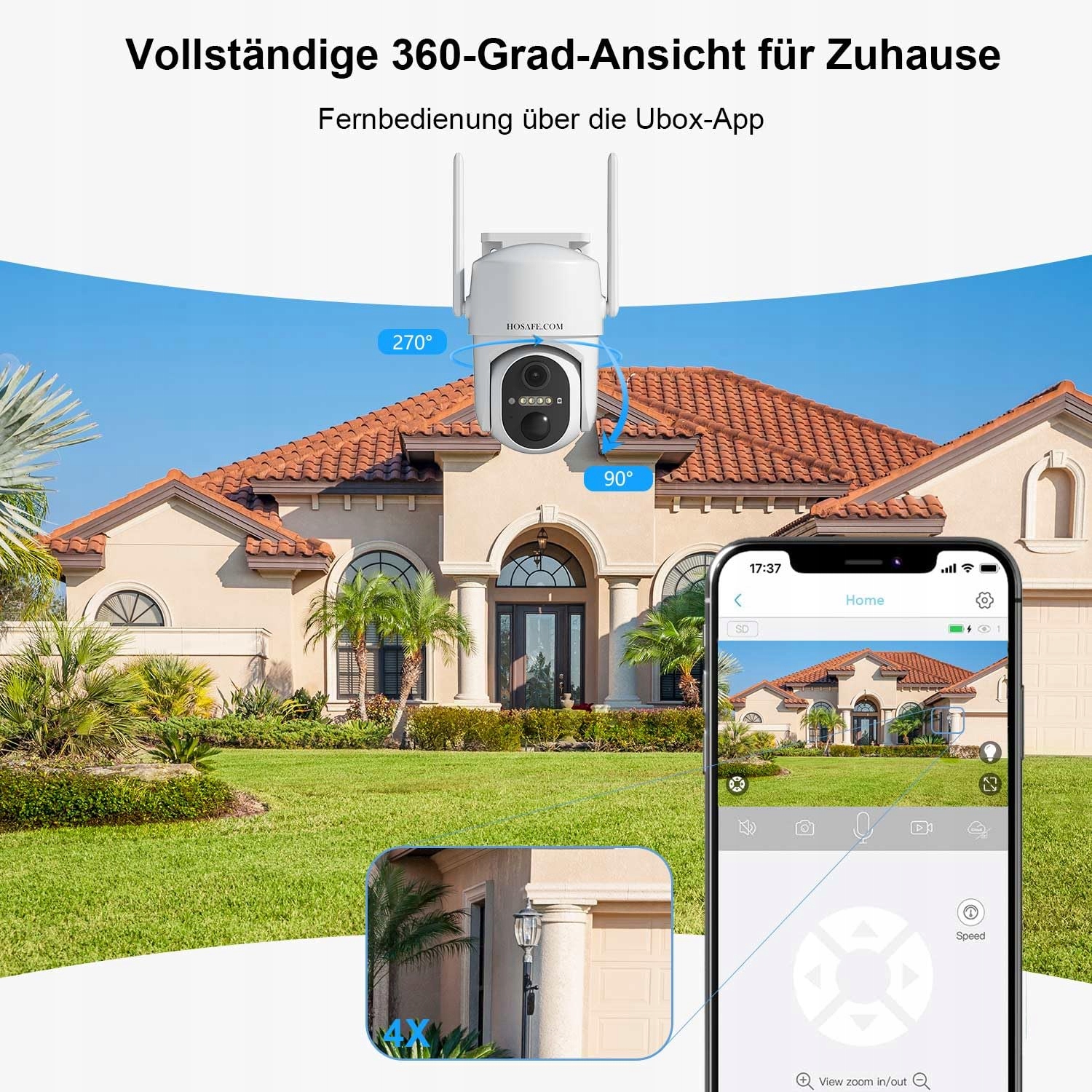 Widok 360° dla kompleksowego monitoringu: Ta kamera 360 stopni może być zdalnie sterowana przez aplikację, obrót o 270°, pochylenie o 90° oraz zoom 4x zapewniają, że nic nie umknie uwadze.