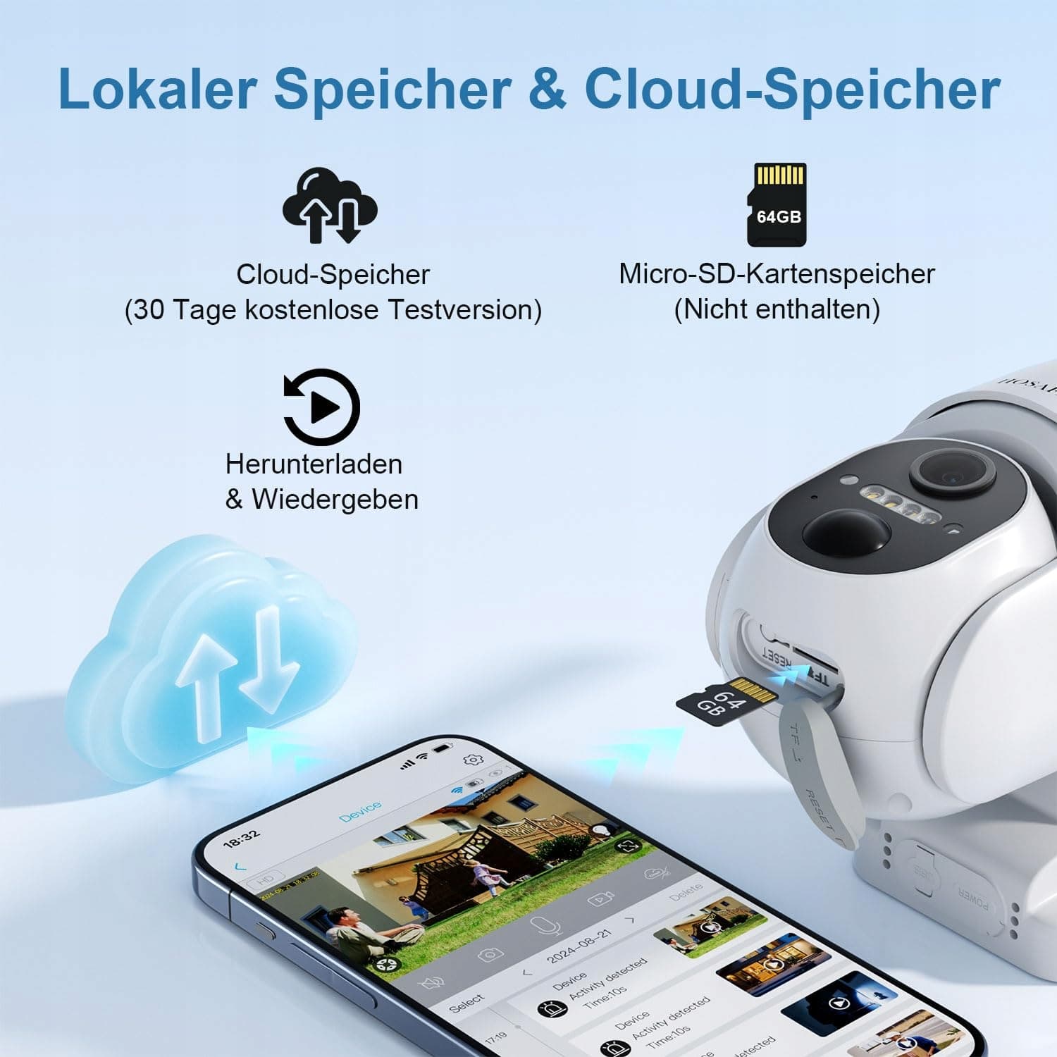 Bezpieczne przechowywanie na karcie SD/Cloud: Filmy są zapisywane na karcie Micro-SD (maks. 128 GB, karta nie jest dołączona). Opcjonalnie możesz korzystać z pamięci w chmurze, aby zabezpieczyć wszystkie nagrania.