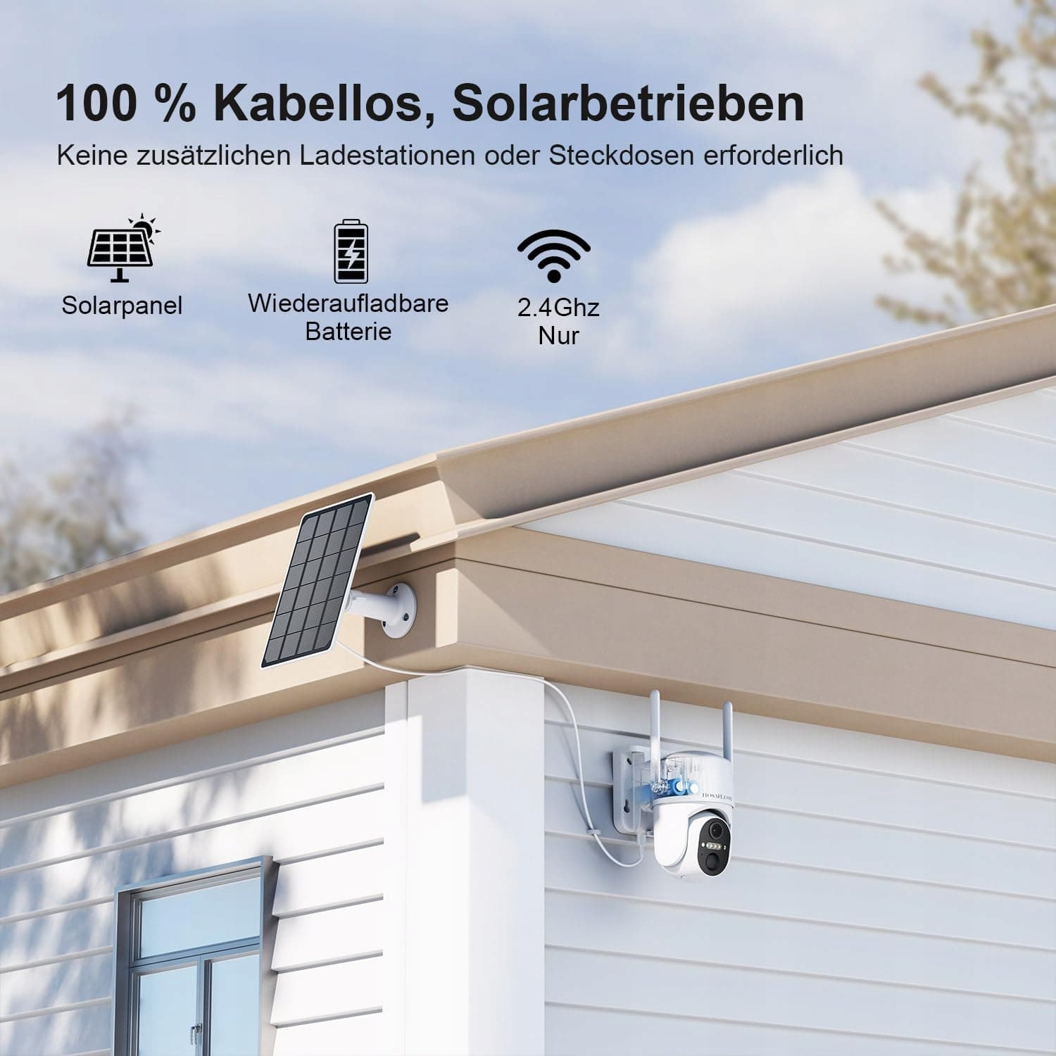 HOSAFE.COM Kamera monitoringu zewnętrznego na akumulator, Kamera zewnętrzna WLAN bezprzewodowa zasilana energią słoneczną, 360 kamer monitoringu z PTZ, czujnik PIR, kolorowy tryb nocny 2K HD, SD/Cloud, wodoodporna IP66