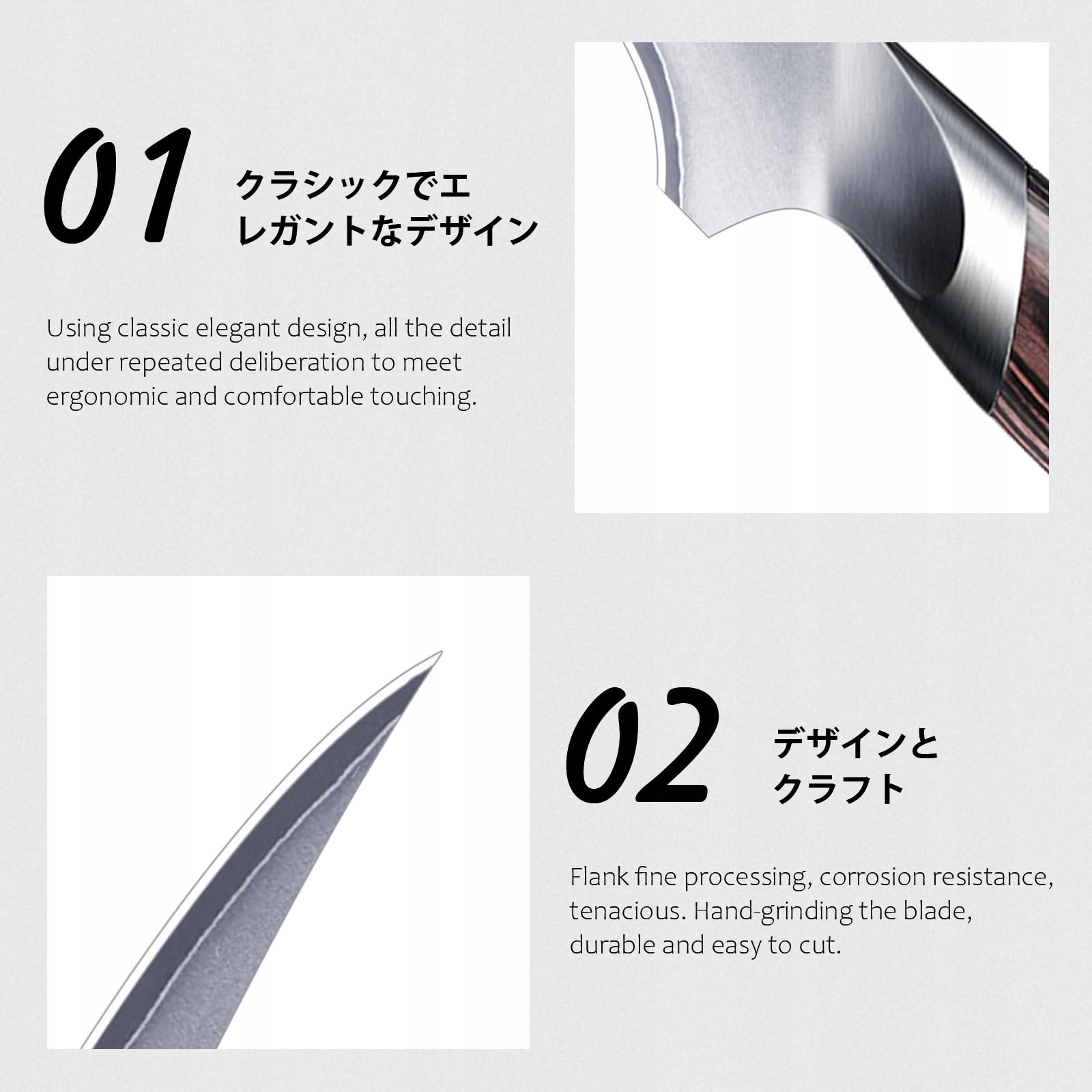 【Ergonomiczny design】 Ergonomiczny kształt rączki noża do filetowania zapewnia wygodniejszy chwyt i zmniejsza zmęczenie użytkownika. Rączka noża do odkostniania wykonana jest z trwałego drewna pakka. Materiały te charakteryzują się dobrą odpornością na korozję i ścieranie, co gwarantuje długą żywotność noża do filetowania.