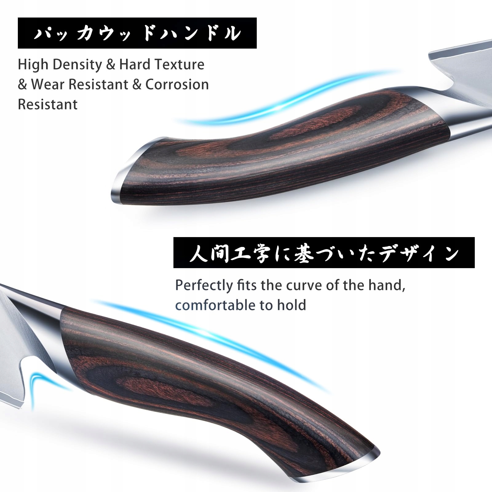 【Ergonomiczny uchwyt z drewna Pakkah】 Ergonomiczny uchwyt zestawu noży został zaprojektowany tak, aby idealnie pasował do każdej formy dłoni i znacznie redukował zmęczenie oraz dyskomfort, które mogą wystąpić przy dłuższym użytkowaniu noża. Waga i środek ciężkości uchwytu są starannie obliczone, co sprawia, że ostry nóż staje się bardziej elastyczny podczas użycia.