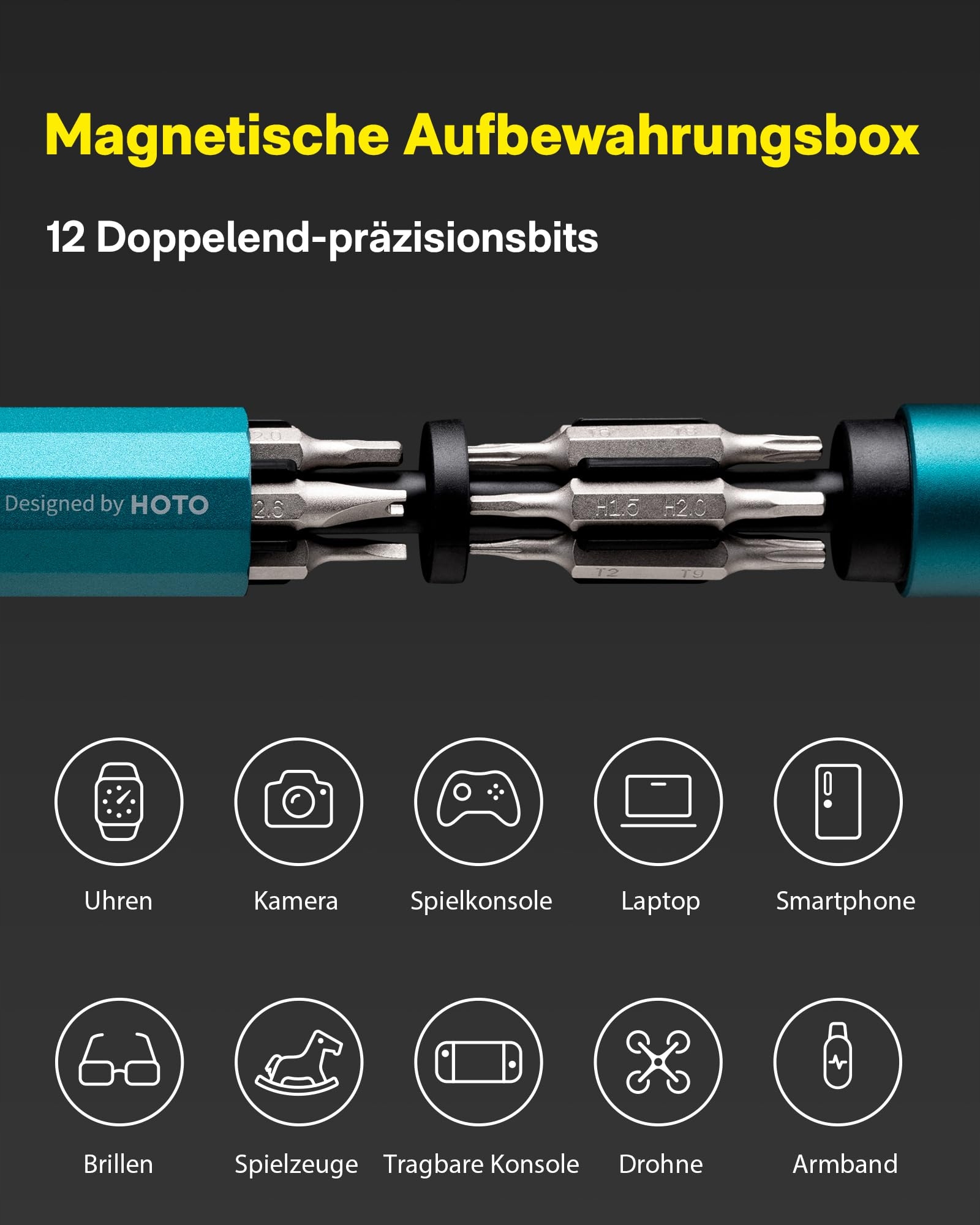 DLACZEGO WYBRAĆ ZESTAW WKRĘTAKÓW PRECYZYJNYCH HOTO 24-W-1 - ❶. 12 bitów dwustronnych, 8 typów, 24 modele dostępne. ❷. Magnetyczne. ❸. Projekt przechowywania w uchwycie. ➍. Stal S2 o twardości 60 HRC, lepsza od CRV. ❺. Obrotowa końcówka 360°. ❻. 120 mm × 16,6 mm i waży tylko 60 g. ❼. Instrukcja obsługi w języku niemieckim.