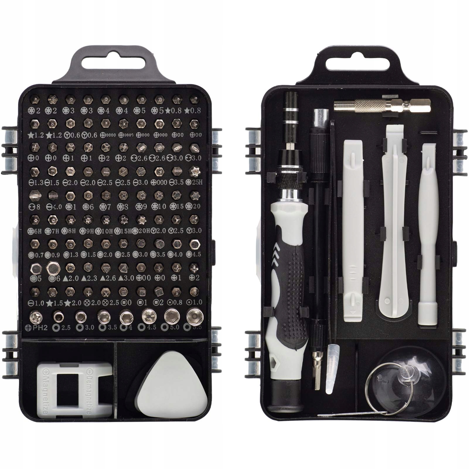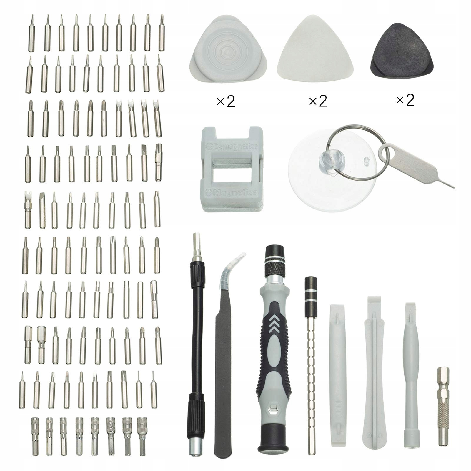 Zestaw wkrętaków zawiera: 115-w-1 zestaw precyzyjnych wkrętaków zawiera 1 mały uchwyt wkrętaka, 98 precyzyjnych bitów i 16 innych niezbędnych akcesoriów do wkrętaków: 1 sześciokątną nasadkę, 1 twardą przedłużkę, 1 miękką przedłużkę, 1 pęsetę, 3 plastikowe spudgery, 6 trójkątnych narzędzi dźwigowych, 1 przyssawkę, 1 narzędzie do wyjmowania kart SIM oraz 1 magnesownik/odmagnesownik/odmagnesownik. Zer