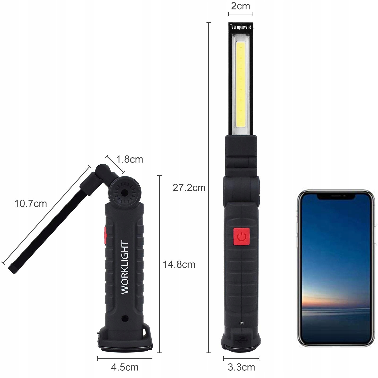 [5 TRYBÓW ŚWIETLENIA I DŁUGI CZAS PRACY]- Ta lampa robocza ma 5 trybów świecenia: wysoka COB LED, niska COB LED / światło przednie / światło czerwone / migające światło czerwone. Z 2 ładowalnymi akumulatorami Li-Ion 1800mAh, może działać przez około 6-8 godzin ciągłej pracy po pełnym naładowaniu.