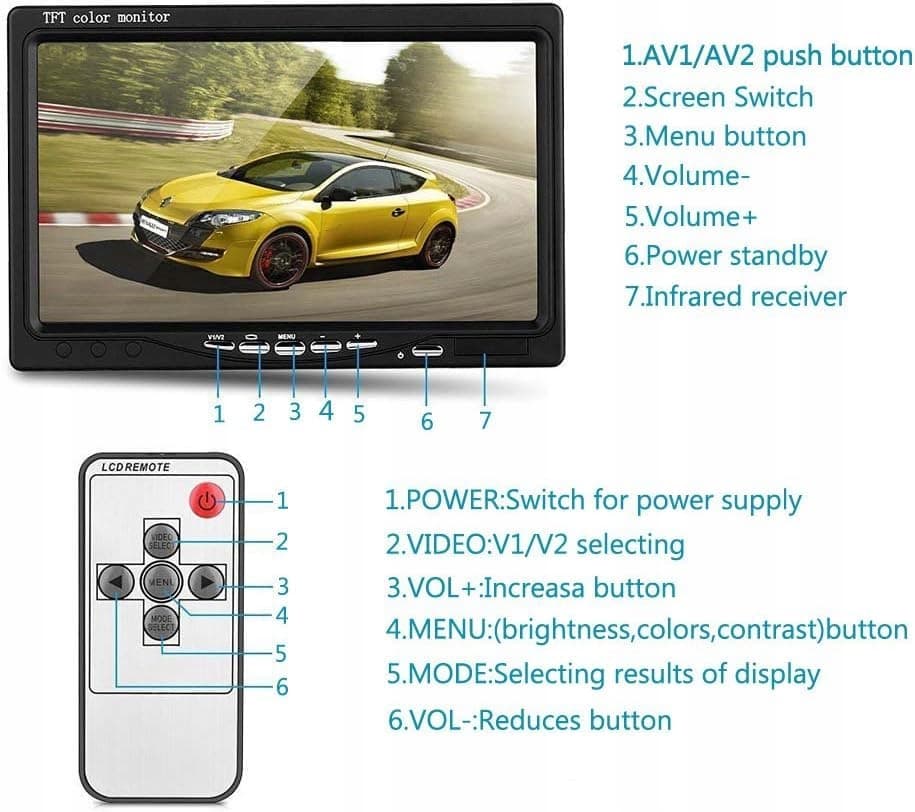 ★ Monitor cofania: 7-calowy szerokokątny ekran TFT-LCD o wysokiej rozdzielczości, pełnokolorowy, 2-kanałowe wejście wideo i ostry obraz. Przełączaj obraz za pomocą przycisku V1 / V2 lub pilota. Obraz można obracać poziomo i pionowo, aby go odbić lustrzanie lub oglądać normalnie. Jasność, kontrast i kolor można regulować. Z pilotem i stojakiem.