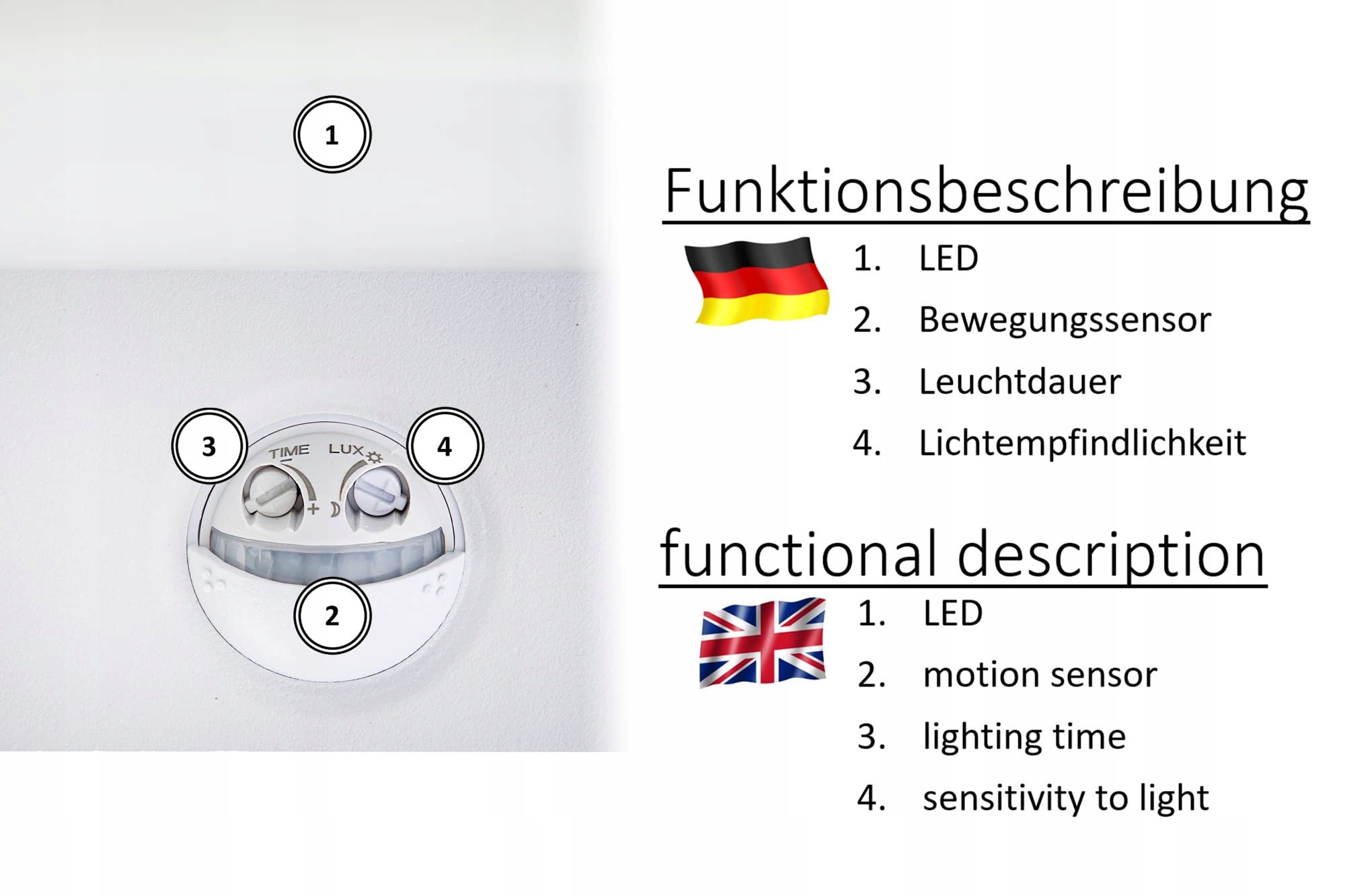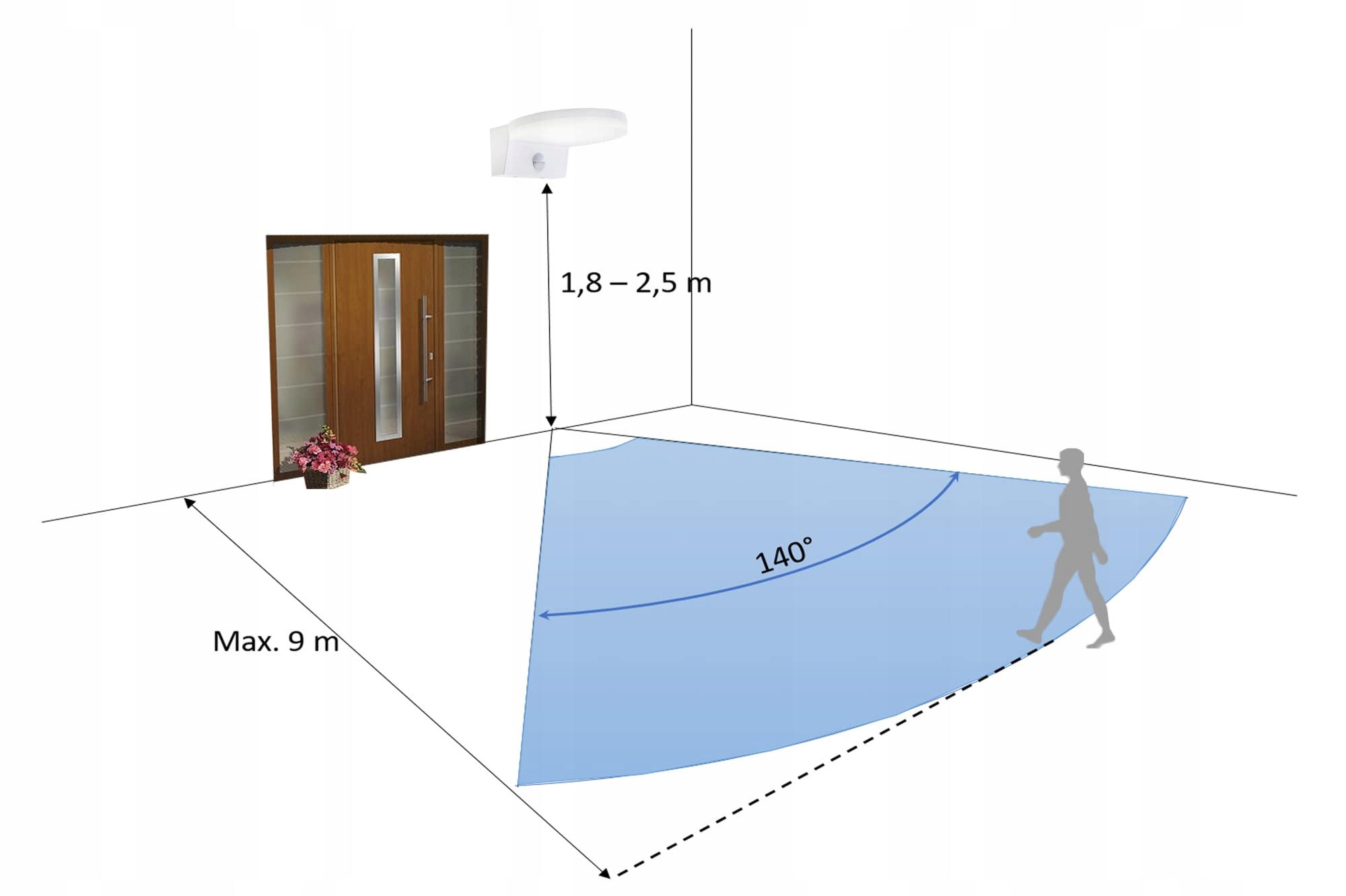 💡 CZUJNIK RUCHU – Czujnik niezawodnie reaguje na ruch dzięki technologii podczerwieni w kącie 140°. Zasięg wykrywania czujnika ruchu wynosi do 9 m. Czas przełączania można płynnie regulować od 10 s do 5 min.