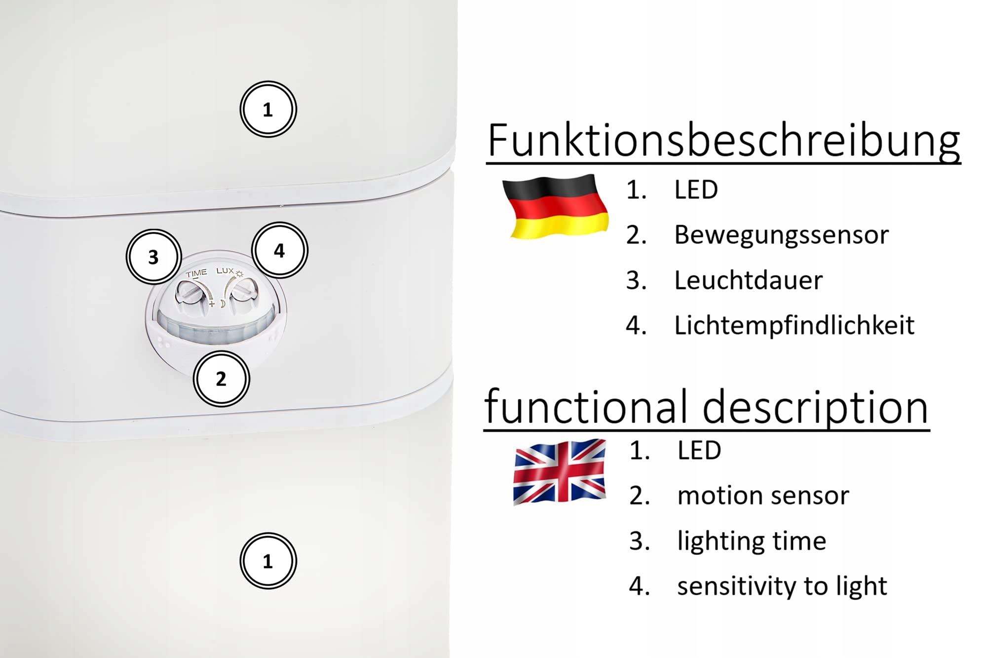 💡 CZUJNIK RUCHU – Czujnik reaguje niezawodnie dzięki technologii podczerwieni na ruch w kącie 140°. Zasięg wykrywania czujnika ruchu wynosi do 9 m. Czas świecenia można płynnie regulować w zakresie od 10 s do 5 min.
