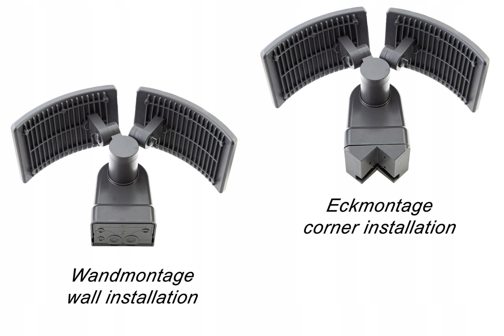 📦 ZAWARTOŚĆ OPAKOWANIA - 1 reflektor LED 2 x 20W neutralna biel (4000K) 4400 lm z czujnikiem ruchu na podczerwień wraz z 2 kołkami rozporowymi, 2 śrubami, 1 uchwytem narożnym, 1 osłoną i niemiecką instrukcją obsługi. Proszę montować reflektor zgodnie z ilustracją. Nie obracać o 180°.