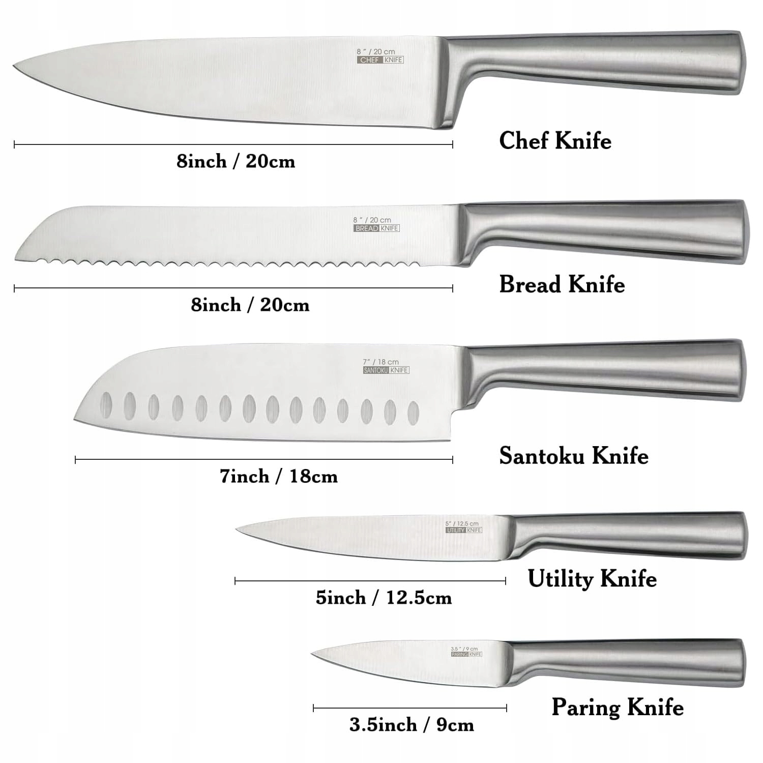 【ZESTAW NOŻY UŻYTKOWYCH 5-CZĘŚCIOWY】 Premium zestaw noży kuchennych zawiera nóż kuchenny 8", nóż do chleba 8", nóż Santoku 7", nóż uniwersalny 5", nóż obierak 3,5". Dobry zestaw noży oznacza, że jesteś przygotowany na wszystko w kuchni, krojenie cebuli, krojenie pomidorów, krojenie chleba i siekanie twardych warzyw.