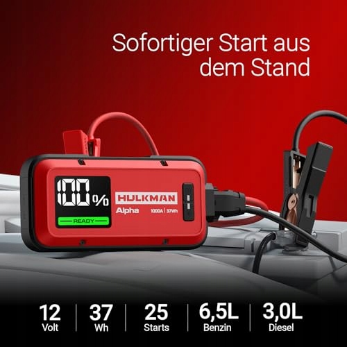 HULKMAN Alpha Ultra Red Rozruch 1000A 37Wh, Lekki i Stylowy, 12V Rozruchowa Skrzynka z Kabli, Pełne Ładowanie w 45 Min, 24 Miesiące Trybu Czuwania, IP65, Wyświetlacz LED, do Silników Benzynowych 6,5L / Diesla 3,0L