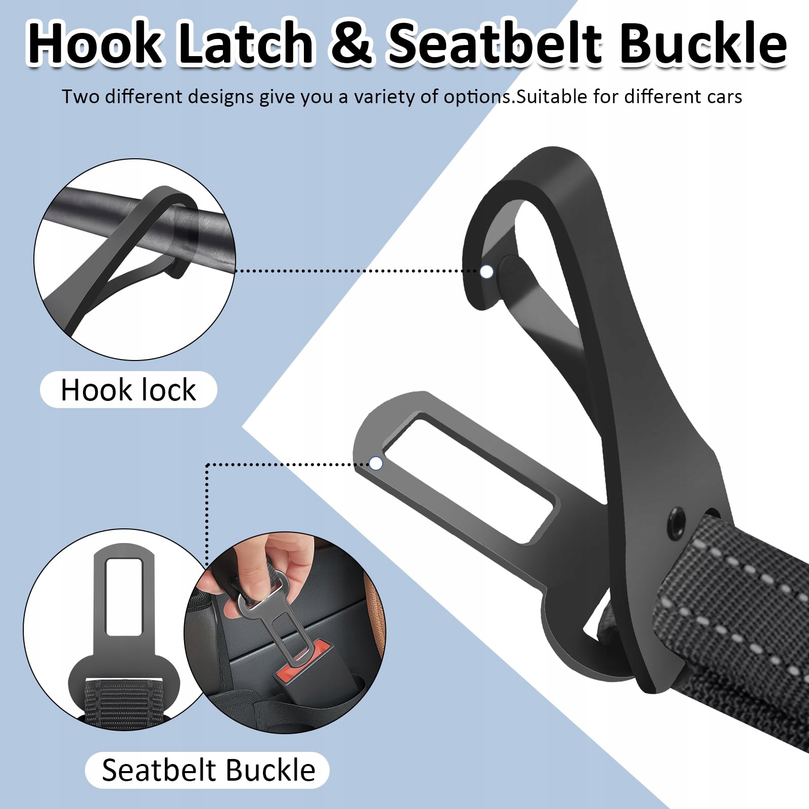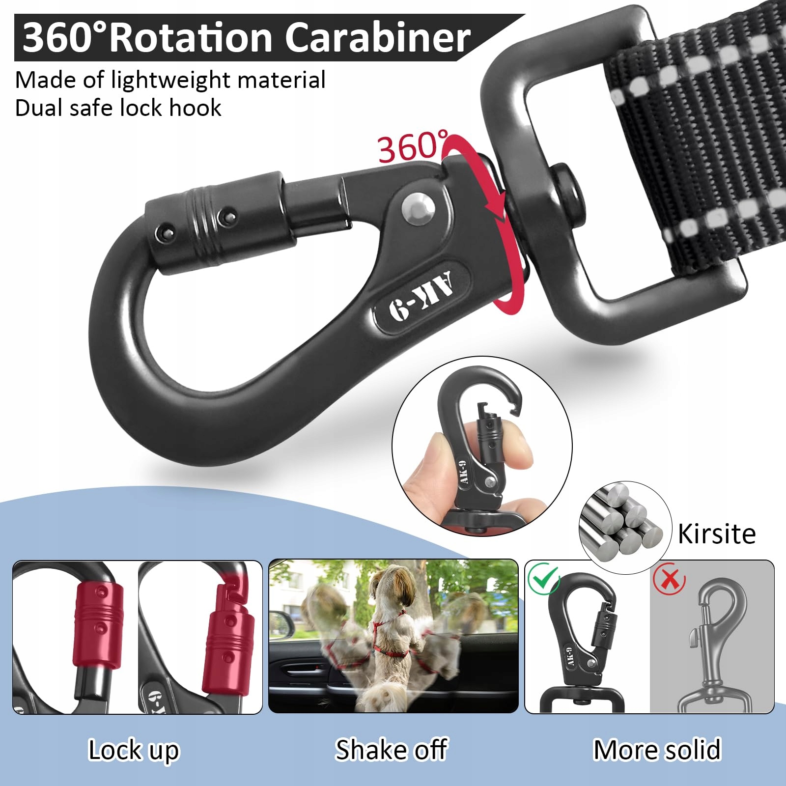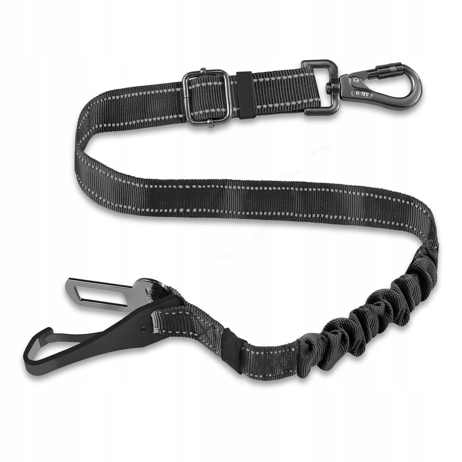 hak ze stopu: projekt haka jest zatwierdzony przez inżynierów mechaników. hak samochodowy wytrzymuje duże napięcia podczas użytkowania. struktura mechanicznego systemu blokującego może zapobiec przypadkowemu otwarciu haka podczas użytkowania. swobodny obrót tego pasa bezpieczeństwa zapewnia, że lina nie zaplącze się ani nie skręci, gdy pies porusza się swobodnie.