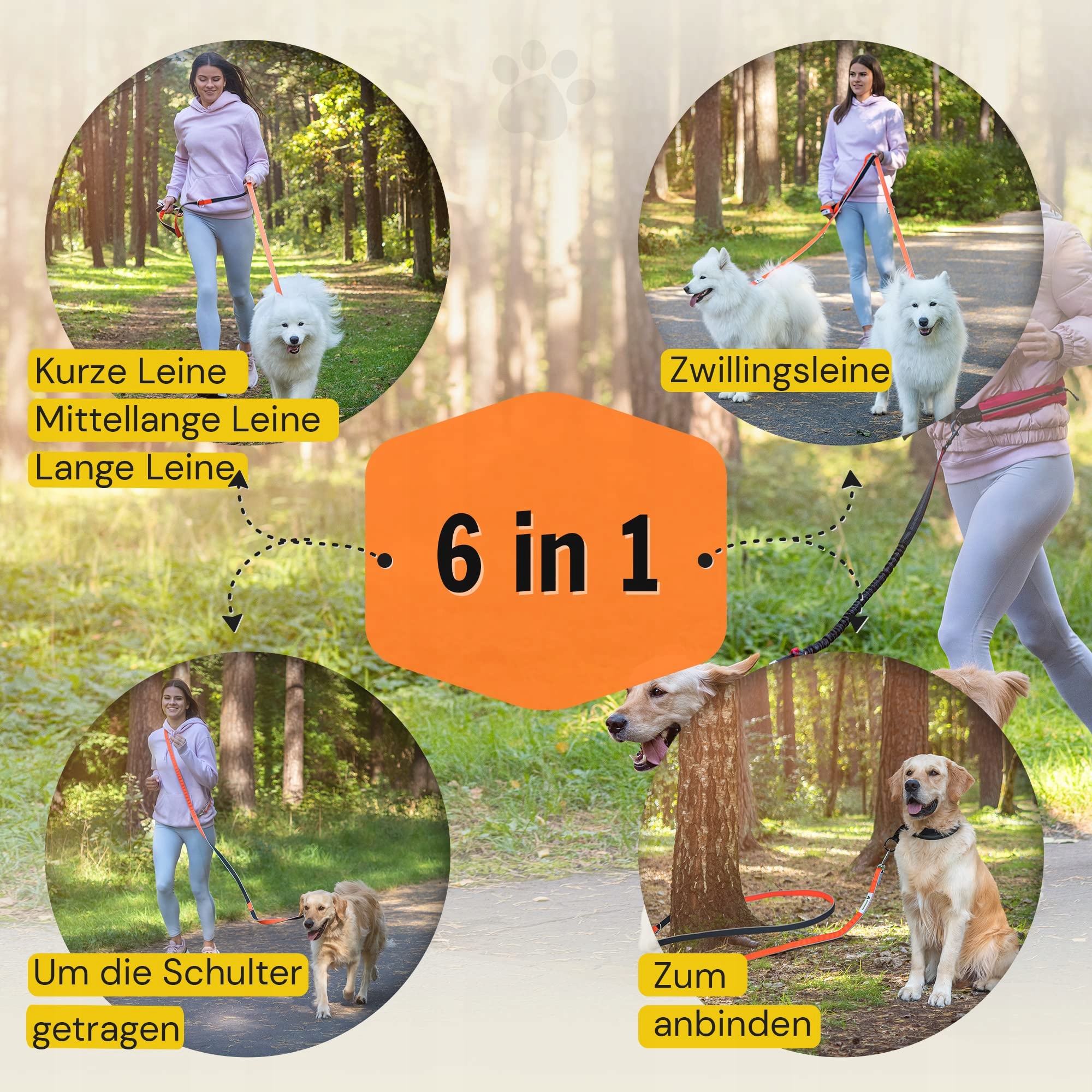 6 FUNKCJI W JEDNEJ SMYCZY: Regulowana jako krótka smycz, średniej długości smycz, długa smycz, podwójna smycz dla dwóch psów, noszona na ramieniu jako smycz na ramię i do natychmiastowego przypięcia