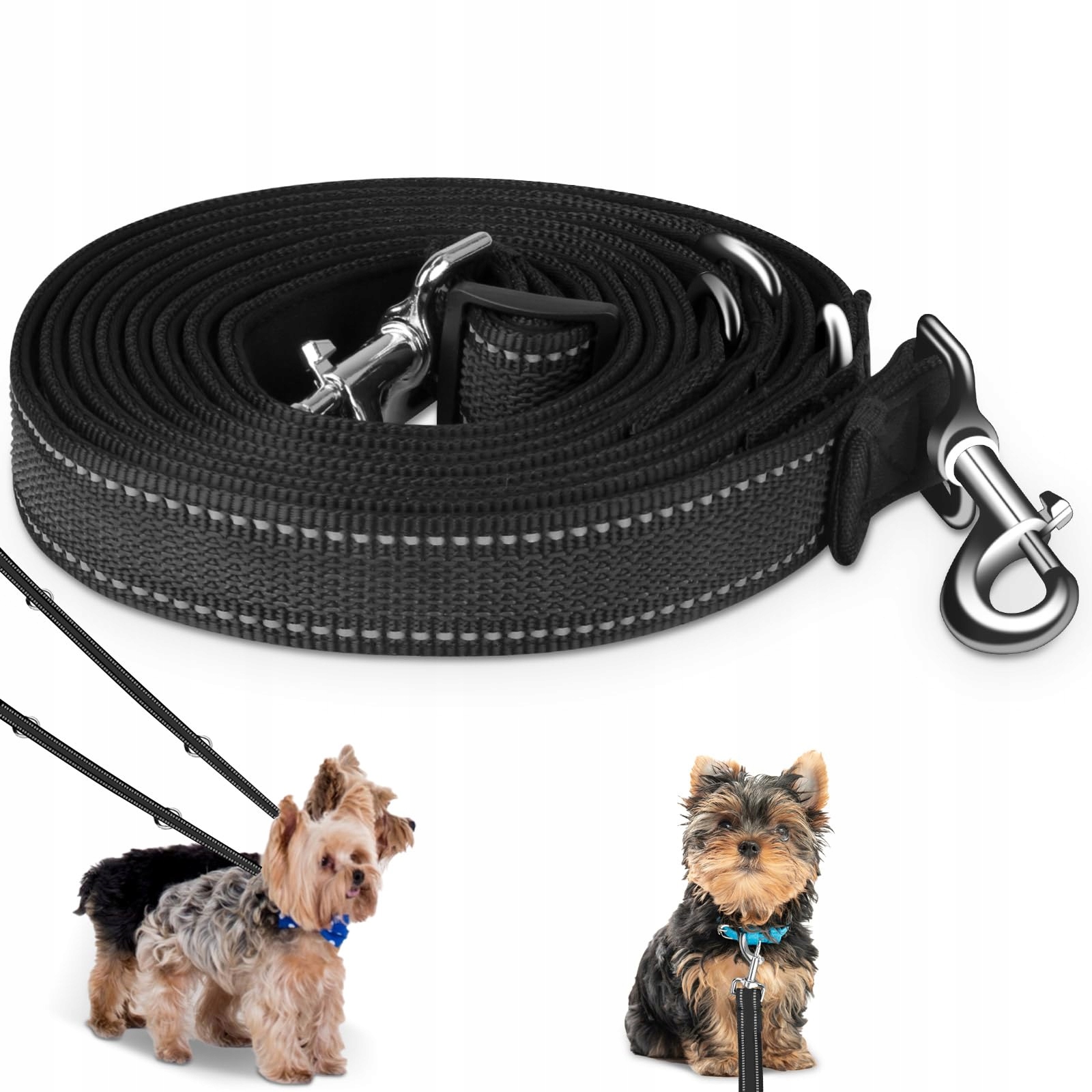 Smycz dla dużych i średnich psów - Regulowana podwójna smycz z nylonu z 2 karabińczykami i 3 pierścieniami - 3m x 15mm (Fluorescencyjna Czarna)