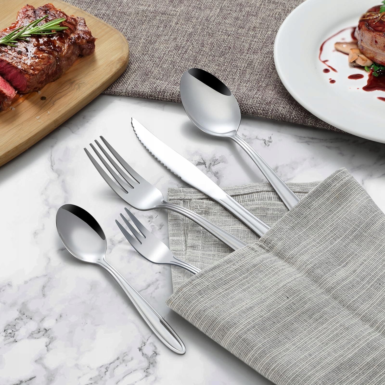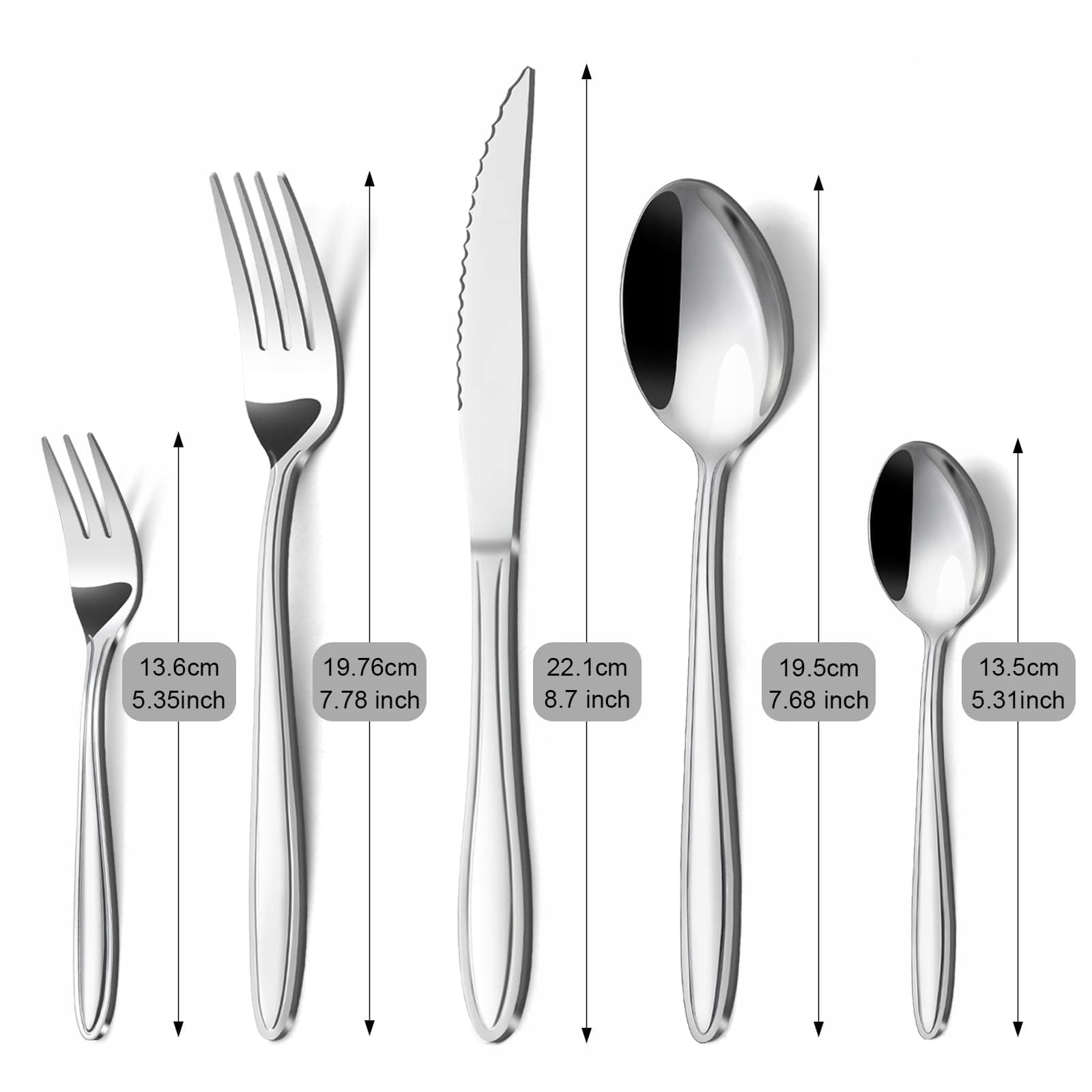 【Zestaw sztućców dla 12 osób】 Nasz zestaw sztućców składa się z 60 części ze stali nierdzewnej, w tym 12 noży stołowych, 12 widelców, 12 łyżek, 12 łyżeczek do herbaty i 12 widelczyków do ciasta, ostry ząbkowany nóż łatwo kroi steki i inne potrawy, zapewniając przyjemne doznania podczas jedzenia.