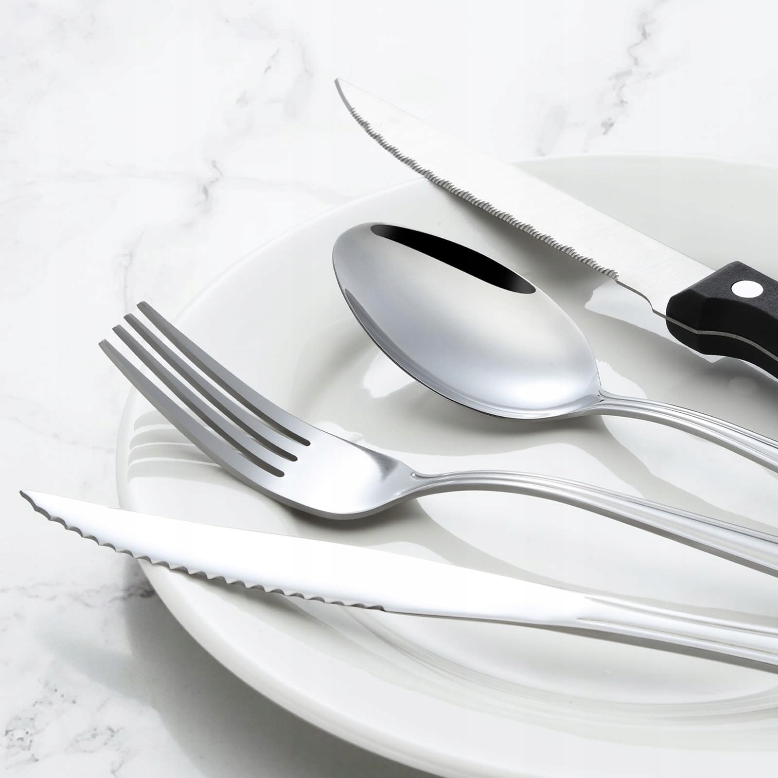 【Klasyczny design】 Kształt uchwytu tego zestawu sztućców został ergonomicznie zaprojektowany, z umiarkowaną wagą i odpowiednią długością dla wygodnego chwytu. Design zestawu jest klasyczny i stylowy, niezależnie czy to elegancka kolacja, rodzinny obiad, impreza, grill czy nawet wyjazd na kemping, pokochasz jego klasyczny i ponadczasowy wygląd.