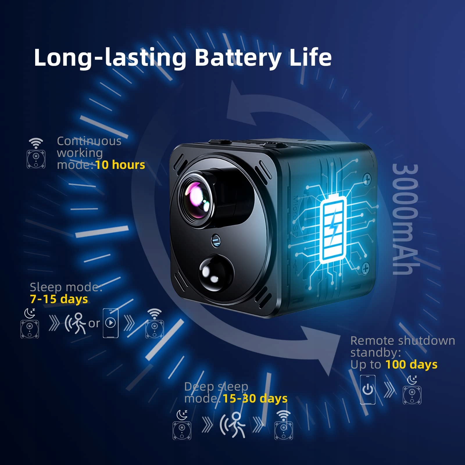 Długi czas pracy akumulatora: Ta mini kamera WiFi do monitoringu ma wbudowany, ładowalny akumulator 3000mAh i trzy tryby pracy dla większych możliwości. Czas pracy akumulatora jako odniesienie: tryb ciągłej pracy (10 godzin); tryb oszczędzania energii (7-15 dni); super tryb oszczędzania energii (15-30 dni); lub tryb czuwania do 100 dni w stanie zdalnego wyłączenia (może być aktywowany przez aplikację).