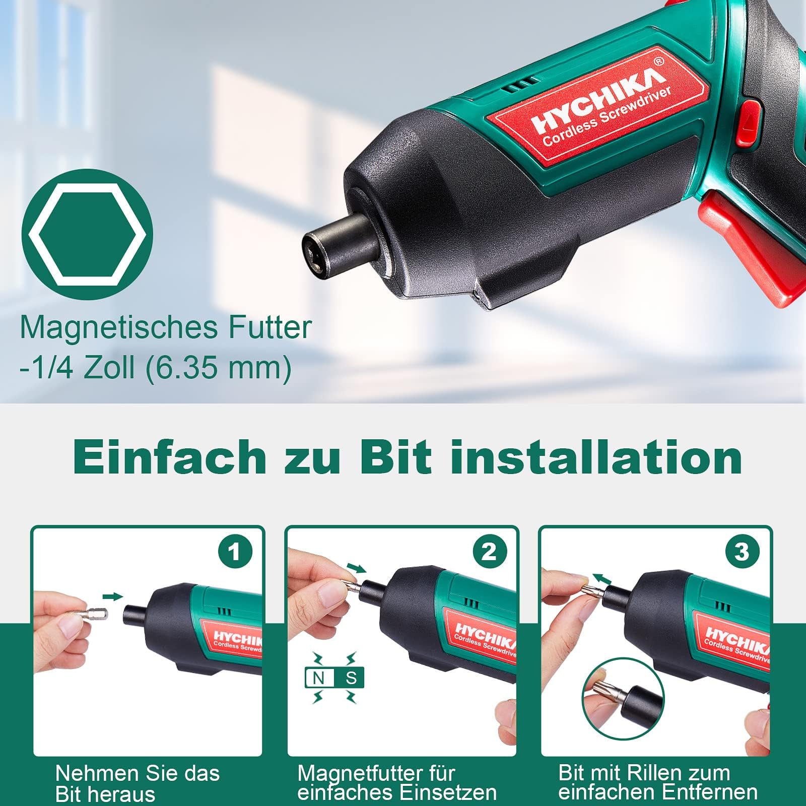 Z 20 AKCESORIAMI: Z 19 bitami i 1 przedłużaczem, wkrętarka HYCHIKA nadaje się do zawieszania i regulacji obrazów, montażu mebli, mocowania zabawek oraz naprawy urządzeń elektrycznych. Wrzeciono ma funkcję samohamowną, która zapewnia wyższy moment obrotowy przy ręcznym użyciu
