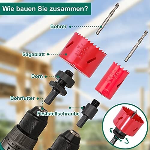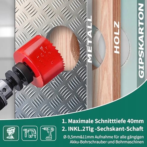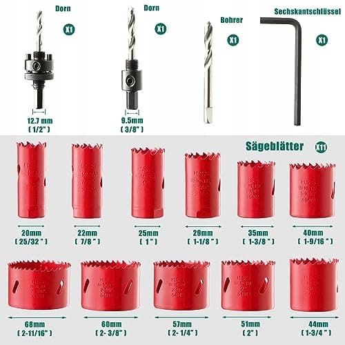 11 OSTRZY I 6 AKCESORIÓW: W zestawie 11 ostrzy: 19mm, 22mm, 25mm, 29mm, 35mm, 38mm, 44mm, 51mm, 57mm, 60mm, 68mm, maksymalna głębokość cięcia 40 mm, 2 sztuki trzpieni, 3 sztuki wierteł do łatwej wymiany, 1 sztuka klucza sześciokątnego