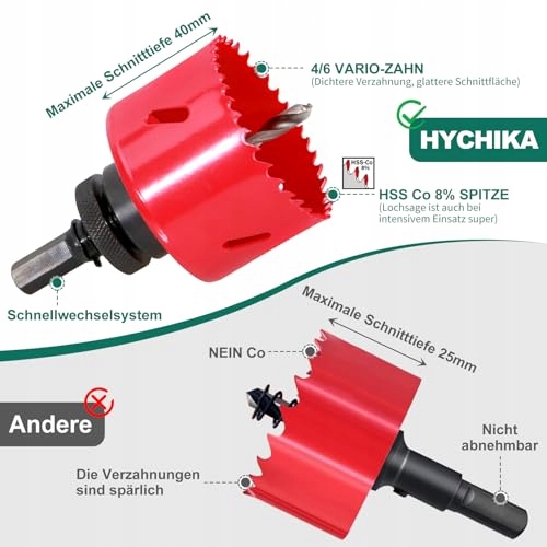WYSOKA JAKOŚĆ: Ostrza pił HYCHIKA wykonane są z materiału bimetalowego, część tnąca składa się z wysokotwardego (69 ~ 81HRC), wytrzymałego stali stopowej o grubości 2mm. Wiertła mogą szybko ciąć, są odporne na rdzewienie, odporne na zużycie i mają długą żywotność