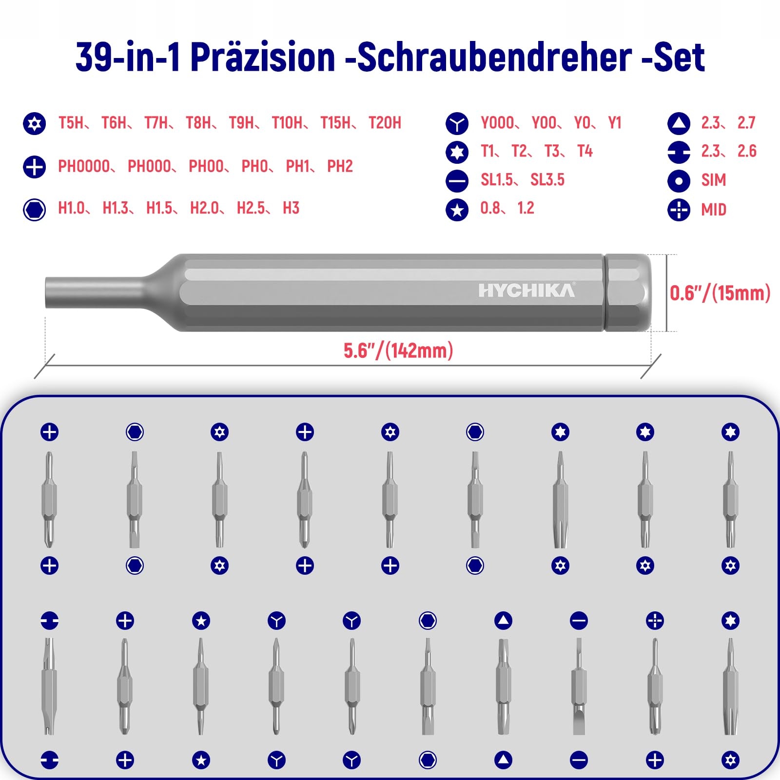 Wszechstronny w użyciu: Idealny do naprawy smartfonów, laptopów, aparatów, okularów, zegarków i innych wrażliwych urządzeń elektronicznych. HYCHIKA 39 w 1 Zestaw wkrętaków precyzyjnych 39-w-1 Zestaw wkrętaków IDEALNY DO: Elektroniki | Okulary | Zegarki | Zabawki | Projekty hobbystyczne | Rowery