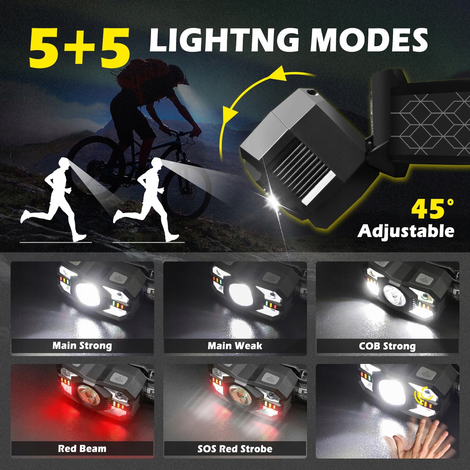 10 TRYBÓW ŚWIETLNYCH, CZUJNIK RUCHU: Wielofunkcyjna latarka czołowa LED oferuje nie tylko 10 różnych trybów świetlnych (5 trybów przyciskowych i 5 trybów czujnika ruchu), ale także czujnik ruchu, który automatycznie przełącza się między trybami w zależności od potrzeb. Latarka czołowa LED z białym i czerwonym światłem do różnych scenariuszy użycia.
