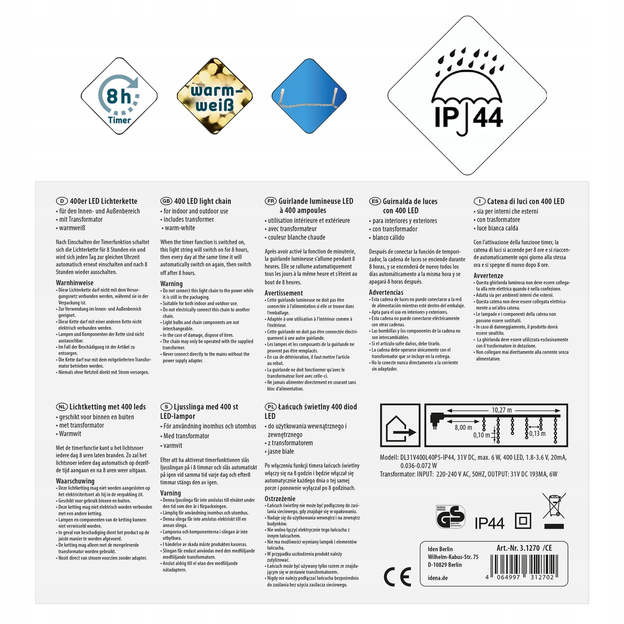 Idena LED łańcuch świetlny sopel lodu z 400 diodami LED w ciepłej bieli, z funkcją timera 8 godzin i transformatorem, długość ok. 10,27 m, dekoracja ogrodu, balkonu, tarasu i na Boże Narodzenie