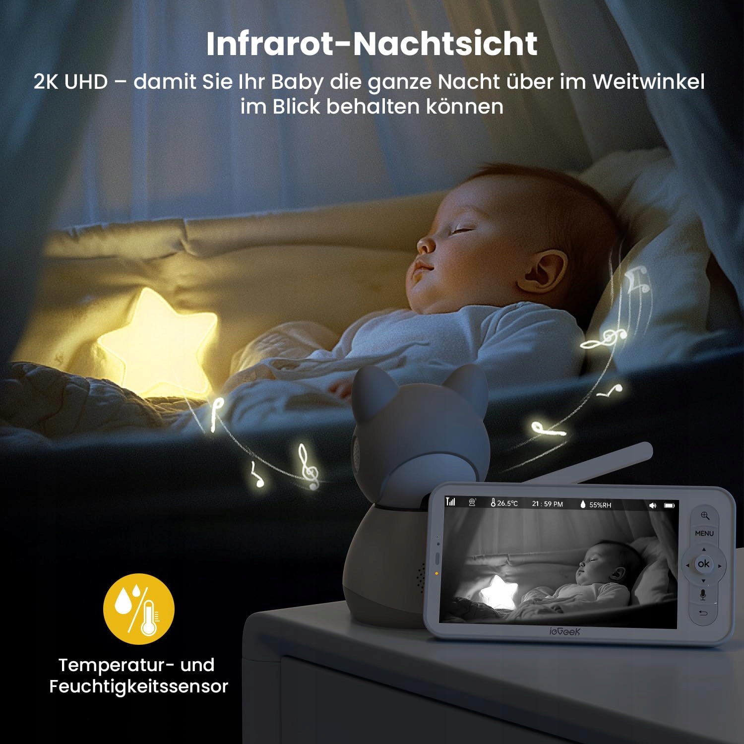 Wyraźny obraz noktowizyjny – chroni Twoje dziecko w każdej ciemności: Niania ieGeek jest wyposażona w kamerę 2K HD oraz nowoczesną technologię podczerwieni. Nawet w całkowicie ciemnych pomieszczeniach 5-calowy ekran (720p HD) zapewnia ostre czarno-białe nagrania noktowizyjne. Każdy oddech, każdy drobny ruch i spokojny sen Twojego dziecka są przekazywane z dokładnością – bez uciążliwego światła czy dźwięków. Dzięki temu chronisz słodki sen swojego dziecka, nie budząc go.