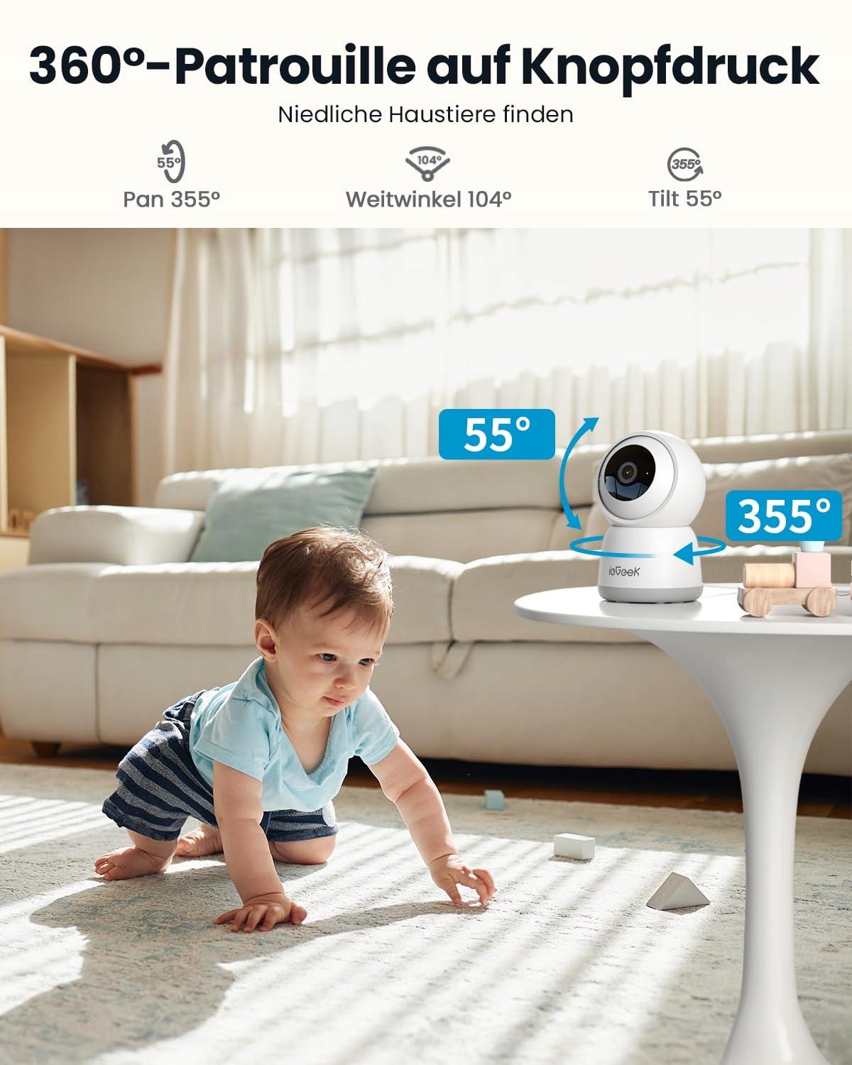 【2K 3MP i szeroki kąt widzenia】ieGeek kamera monitoringu wewnętrznego, 3MP (2304*1296 pikseli), ultra HD jakość obrazu, poprawiona ostrość obrazu, lepsze wrażenia wizualne niż kamera 1080P do użytku wewnętrznego. Pole widzenia PTZ 360°Pan/55°Tilt, obiektyw szerokokątny 104°, uruchomienie kamery wewnętrznej, inteligentna automatyczna kalibracja (30 sekund), aby chronić bezpieczeństwo rodziny!