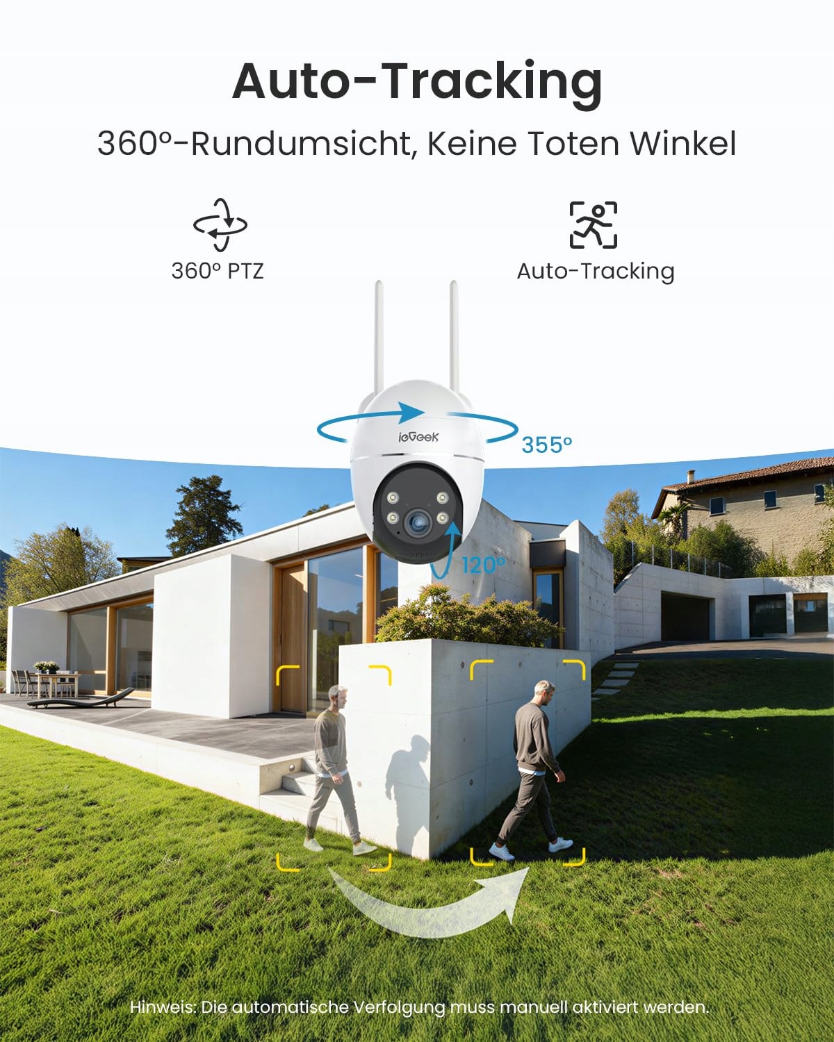 ieGeek 24/7 AOV Kamera monitorująca na zewnątrz z automatycznym śledzeniem, 2K 360° PTZ Kamera solarna z panelem słonecznym 5W i akumulatorem 9000mAh, 30m kolorowa nocna wizja, kamera zewnętrzna WLAN bezprzewodowa z inteligentnym wykrywaniem, S7