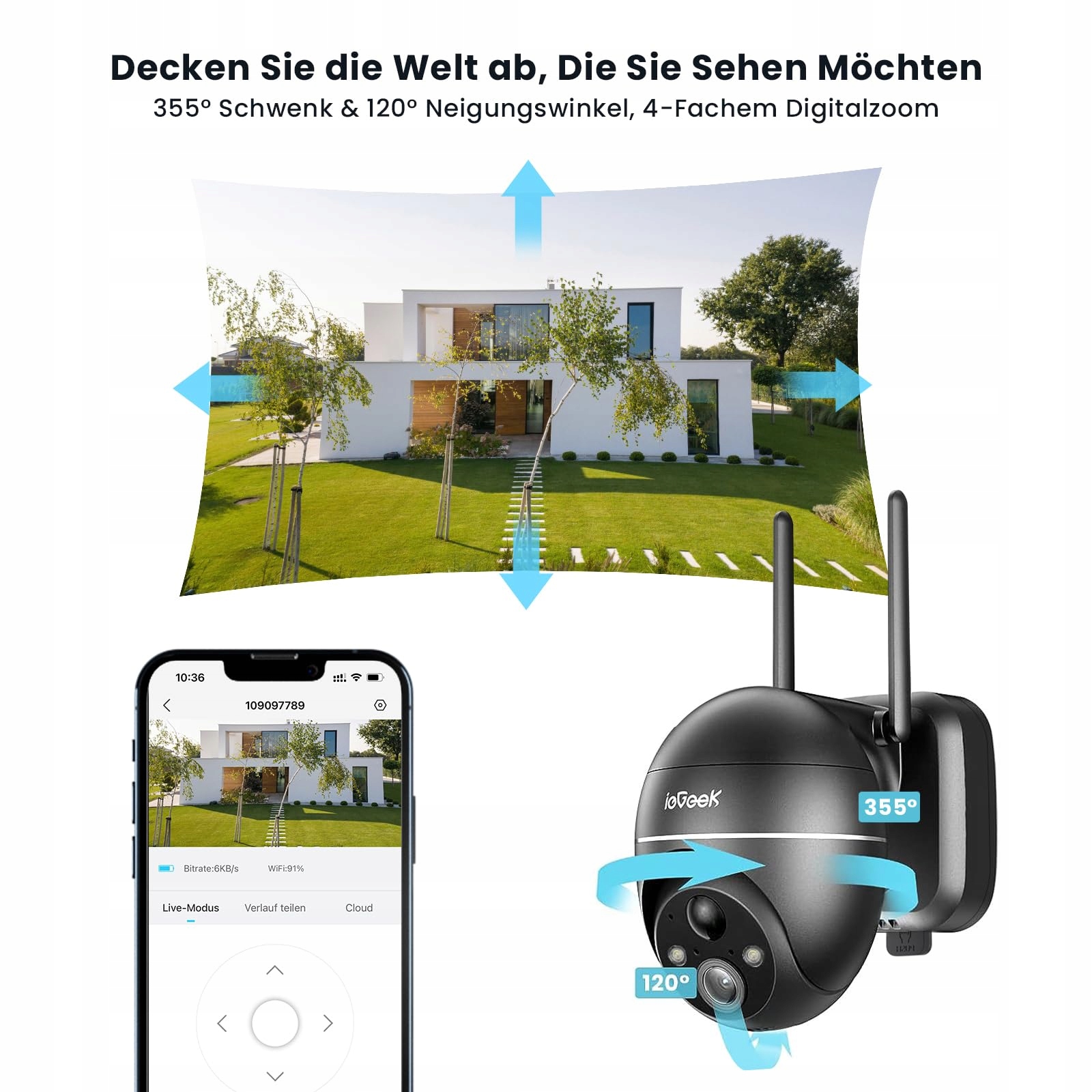 ieGeek 5MP Kamera monitoringu zewnętrznego na akumulator, PTZ kamera monitoringu zewnętrznego WLAN z panelem solarnym, czujnik ruchu PIR, 30M kolorowa noktowizja, dwukierunkowe audio, 2.4GHZ WiFi, antena WLAN 4DBi, kamera Alexa