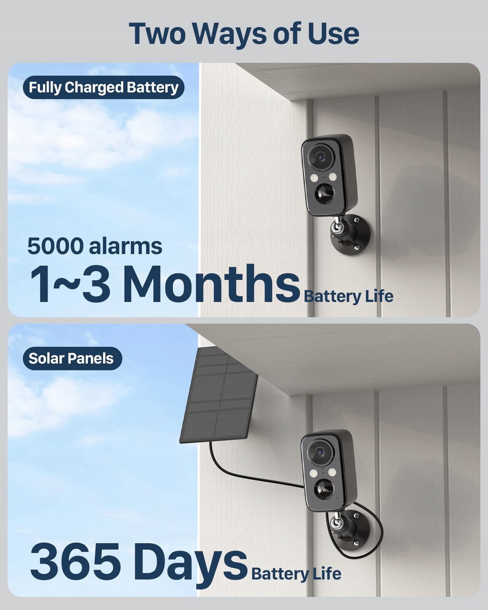 [Kamera monitorująca z panelem słonecznym - Naprawdę bezprzewodowa]Kamera monitorująca WLAN na zewnątrz jest wyposażona w panel słoneczny, aby umożliwić Ci naprawdę bezprzewodowe życie. Przy tylko 2 godzinach ładowania dziennie, ta kamera IHOXTX WLAN outdoor może chronić Twój dom przez cały rok. Kamera WiFi ma pojemność baterii 5200 mAh. Nawet bez światła słonecznego może działać przez 1 do 3 miesięcy (uwaga: kamera nie jest kompatybilna z WiFi 5G).