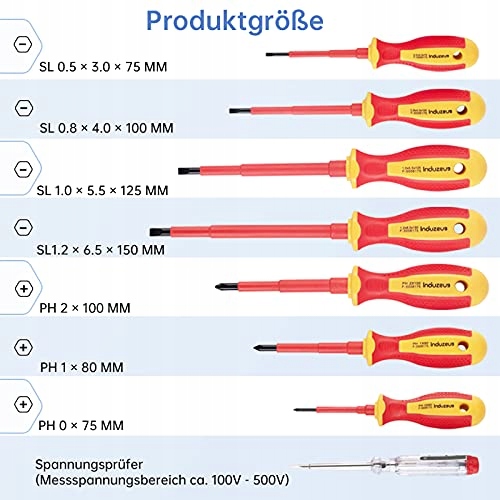 【ZAWARTOŚĆ】z izolacją VDE, gwarantujące bezpieczną pracę do 1.000 Voltów, w tym taśma samoprzylepna VDE, wkrętak krzyżowy PH 0 x 75 mm, PH 1 x 80 mm, PH 2 x 100 mm. Wkrętak płaski, SL 0,5 x 3,0 * 75 mm, SL 0,8 x 4,0 * 100 mm, SL 1,0 x 5,5 * 125 mm, SL 1,2 x 6,5 * 150 mm. 4 sztuki szczypiec VDE, 160 mm VDE nożyce boczne. 160 mm VDE szczypce długie. 160 mm VDE szczypce do ściągania izolacji. 180 mm VDE szczypce uniwersalne. 1- tester napięcia, zakres pomiaru napięcia około 100V ~ 500V. 2- taśma samoprzylepna VDE.