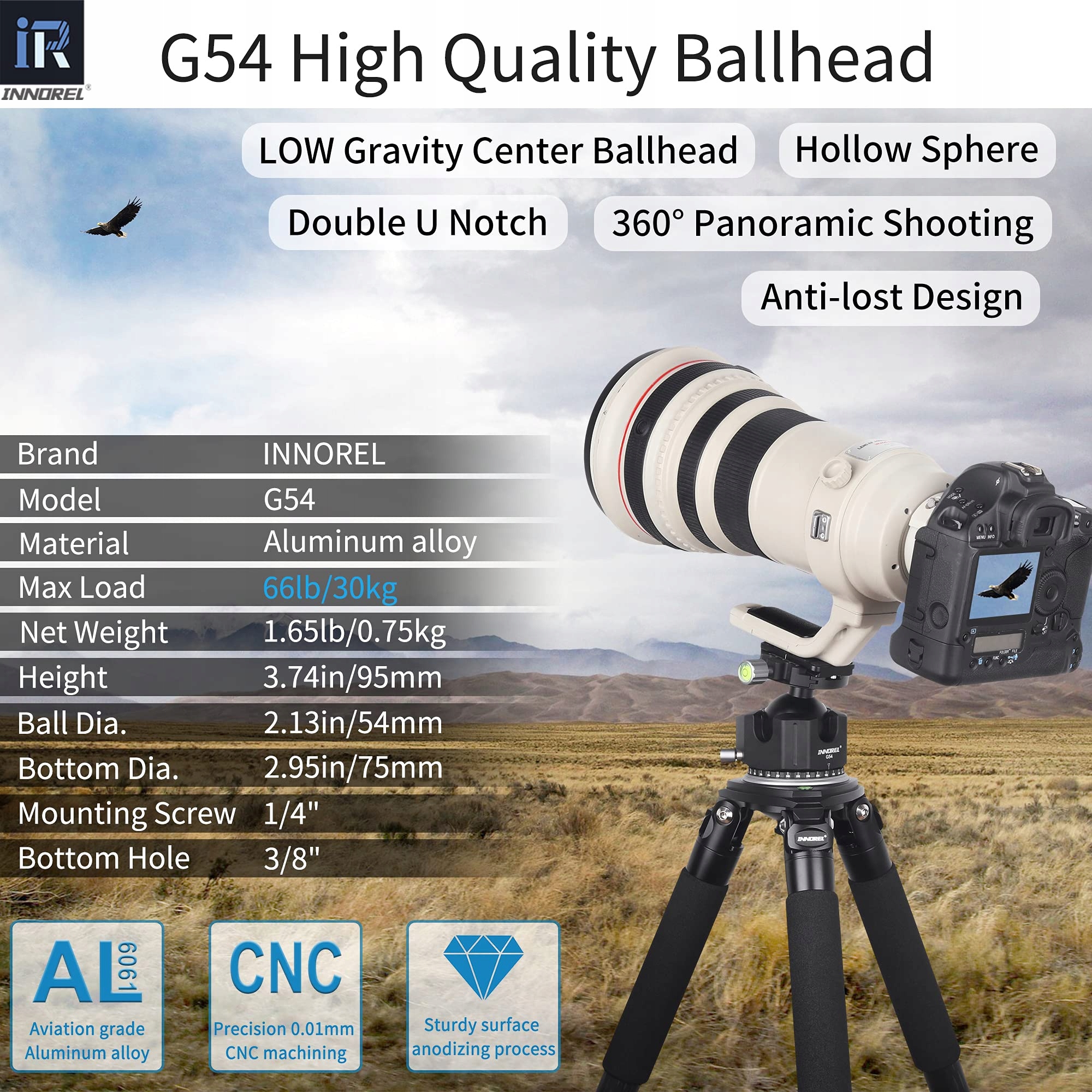 Low Profile Tripod Ball Head-INNOREL Panoramic CNC Metal Camera Tripod Ballhead z płytką szybkiego montażu Arca Swiss 1/4'' Głowica z aluminium do statywów, monopodów, DSLR, kamer, maksymalne obciążenie 30kg (G54)