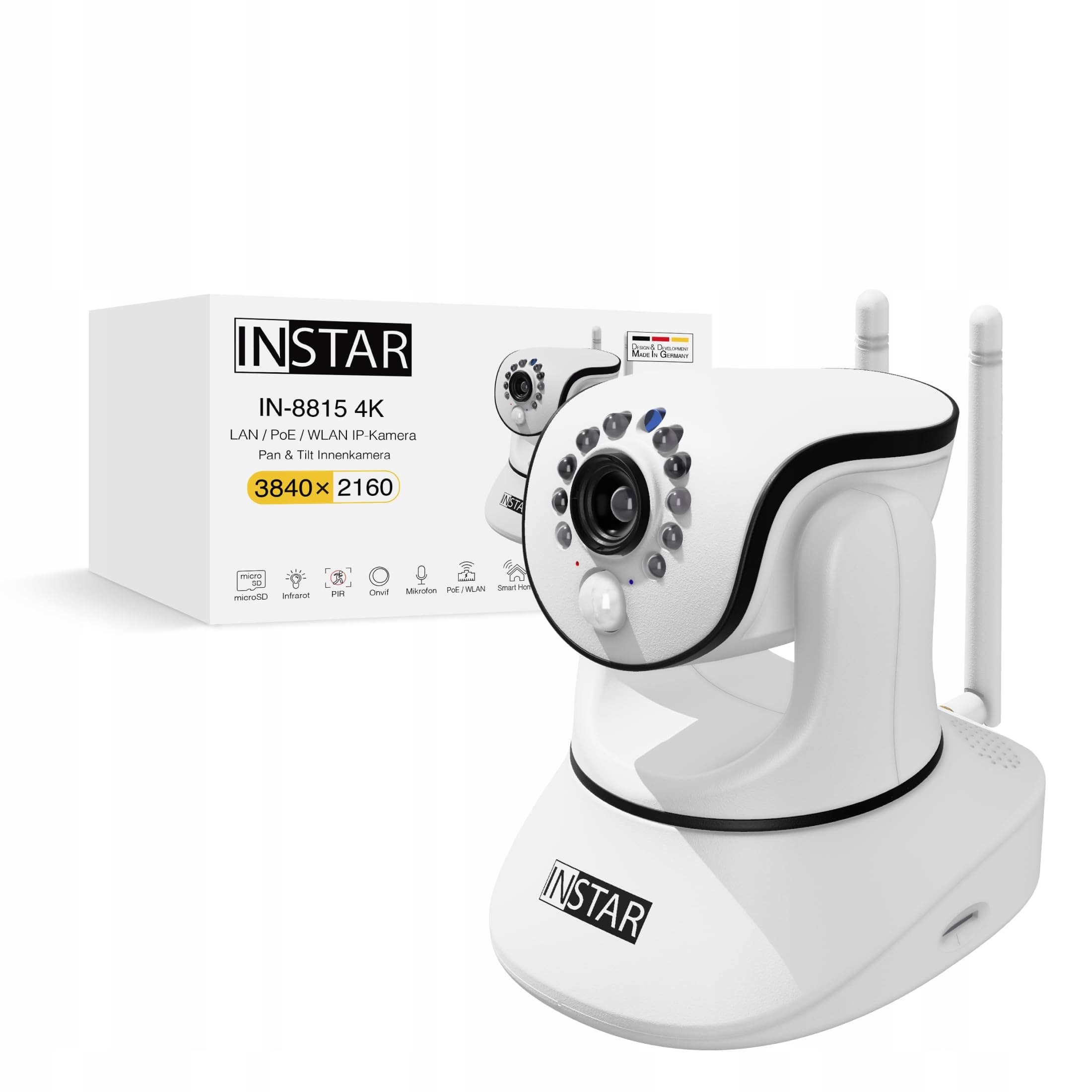 INSTAR IN-8815 4K kamera wewnętrzna biała, WLAN/LAN/PoE, sterowana kamera PT IP, HomeKit Secure Video, AI-rozpoznawanie osób, IR-nocne widzenie, audio dwukierunkowe, alarm I/O, wyjście audio, MQTT, WPA3
