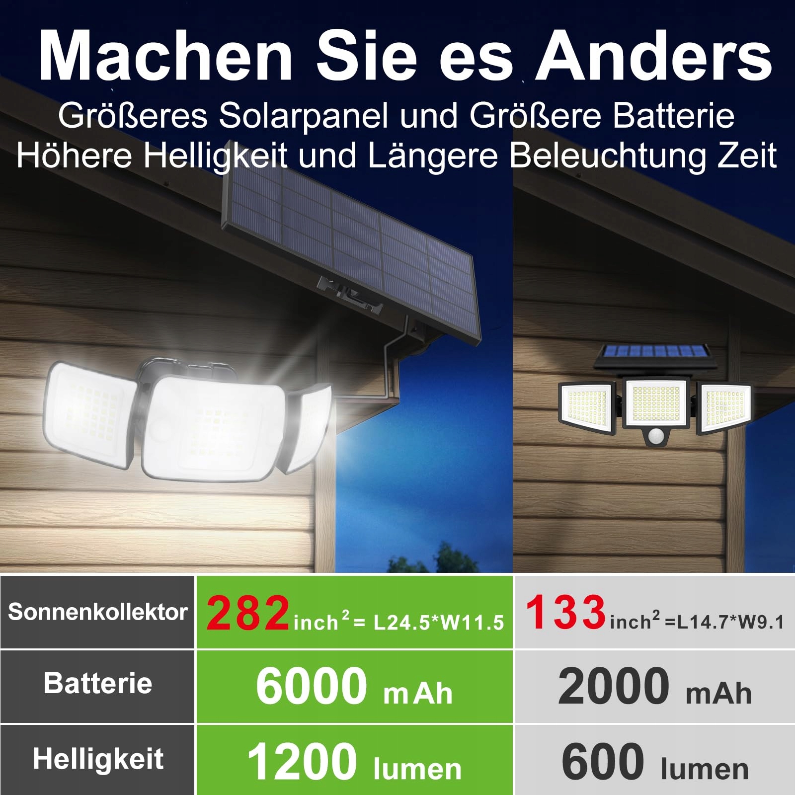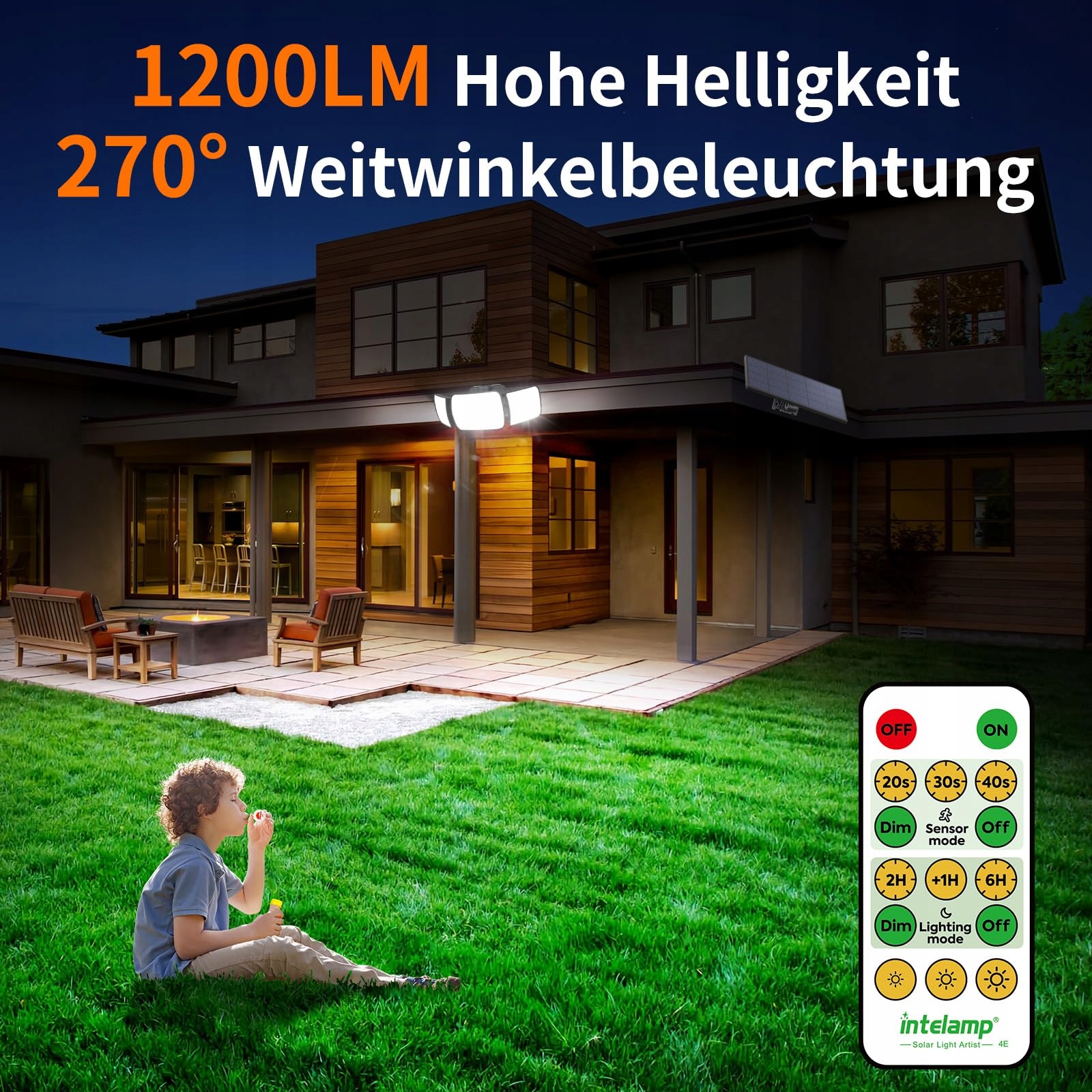 Oświetlenie szerokokątne: intelmap super jasna lampa solarna z czujnikiem ruchu, 108 diod LED o wysokiej jasności (jasność do 1200 lumenów). Przy rozłożonych skrzydłach LED, gdy są złożone, kąt rozproszenia wynosi do 270 stopni. Projekt oświetlenia tej lampy solarnej intelamp oświetla obszar około 70 metrów kwadratowych, co pozwala na łatwą orientację i dobrą widoczność szczegółów.